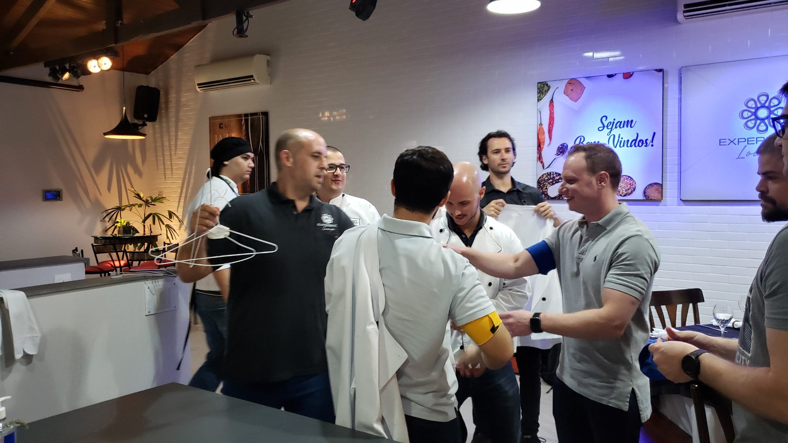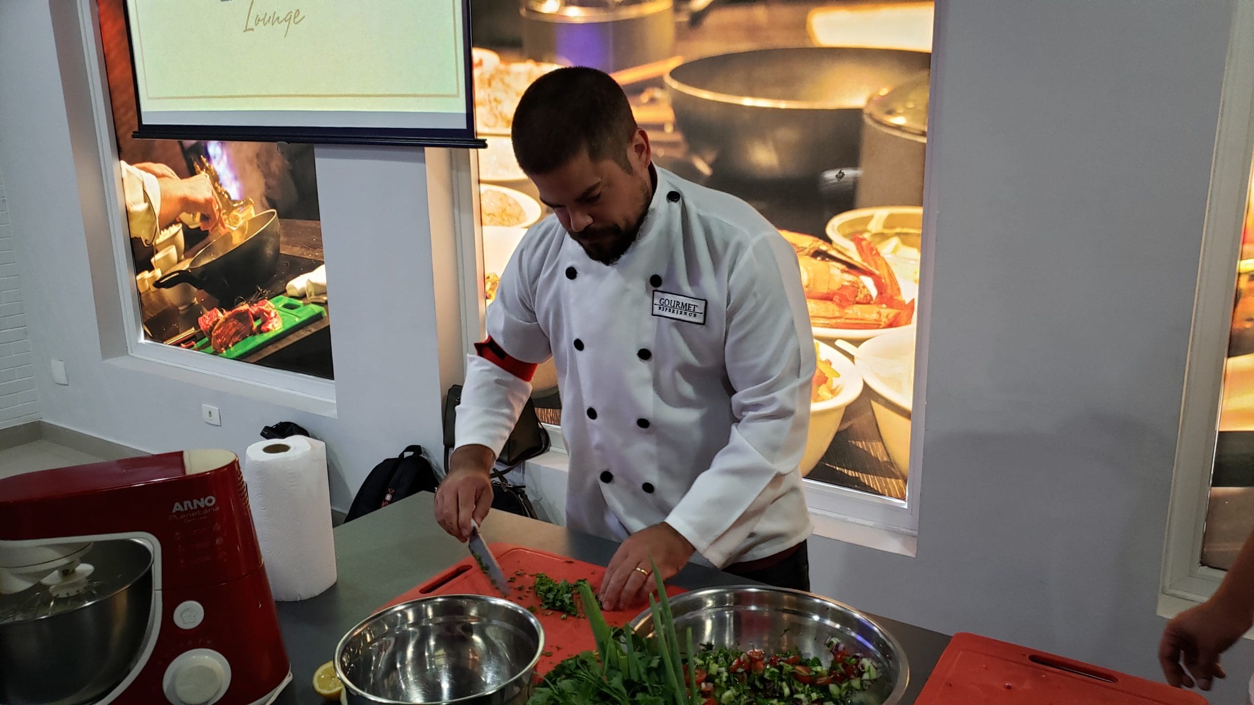 Perto da hora do almoço, todos saborearam um coquetel com finger food e assistiram a uma breve explicação de como seria a atividade que estaria por vir, sob o comando do chef Marcelo Mendes.