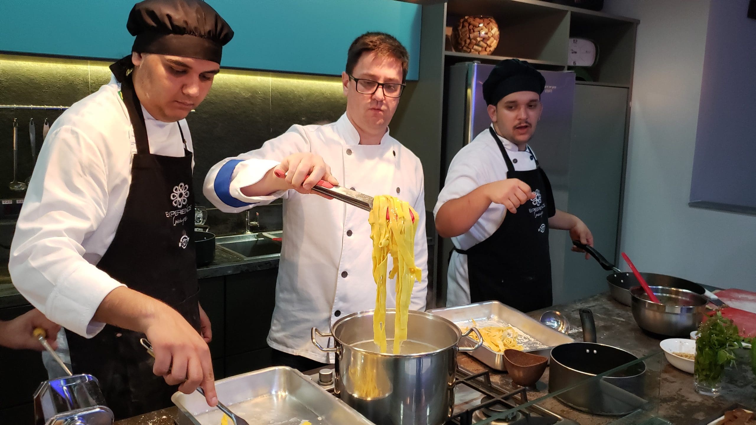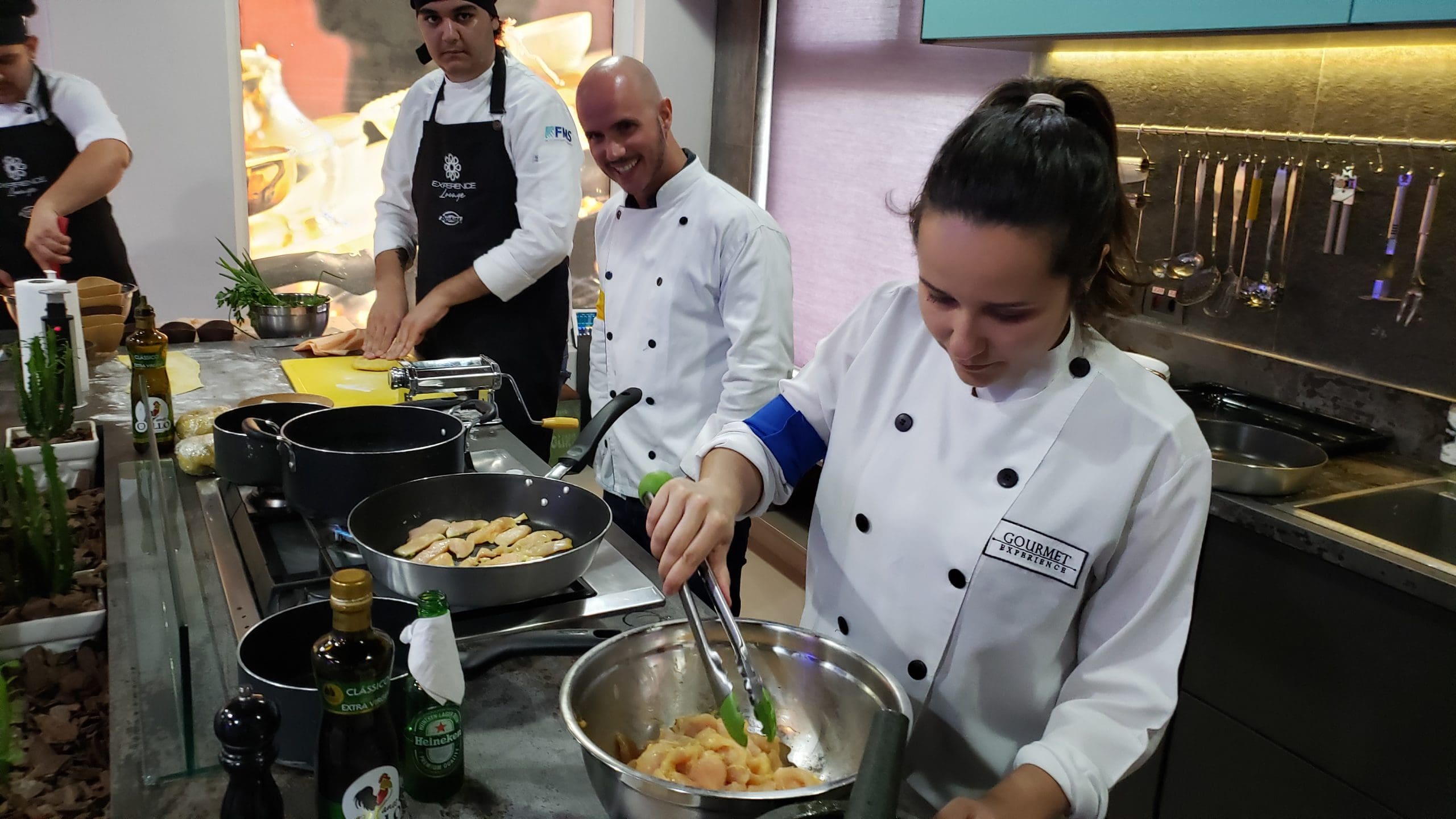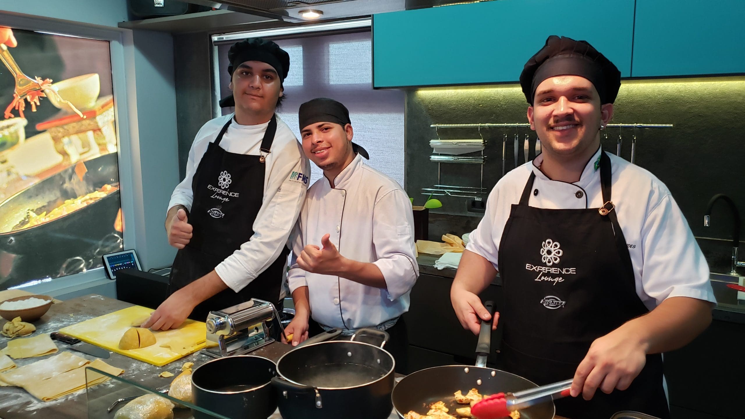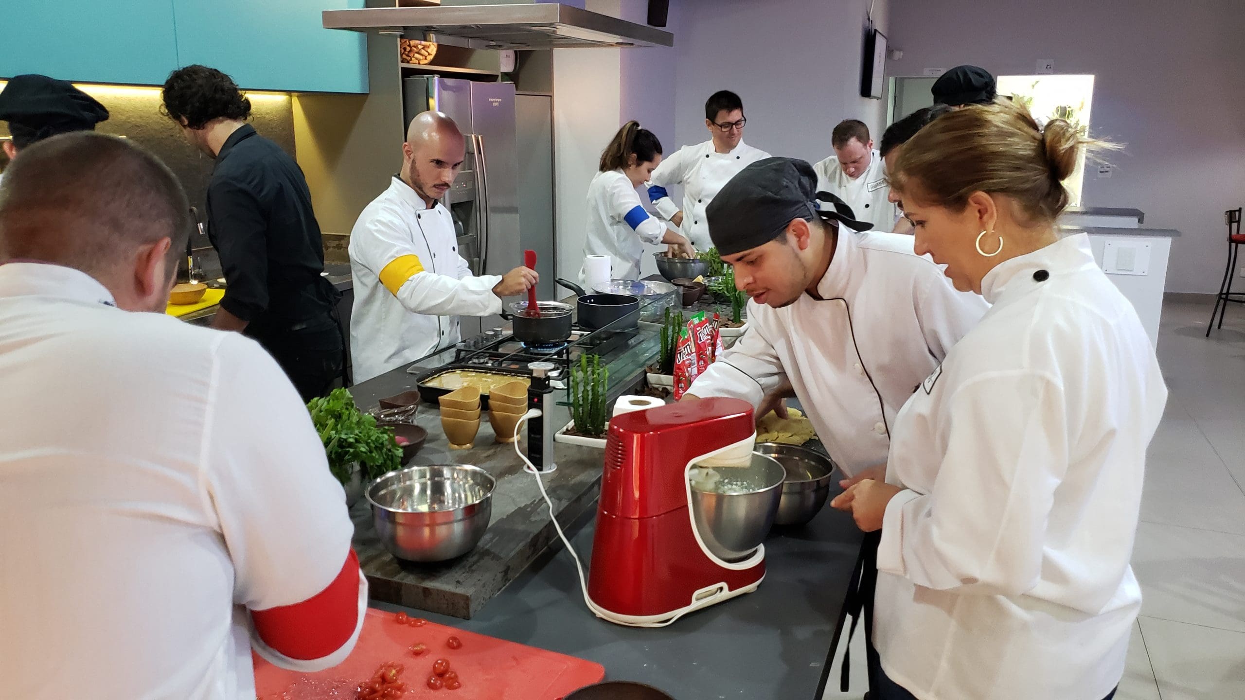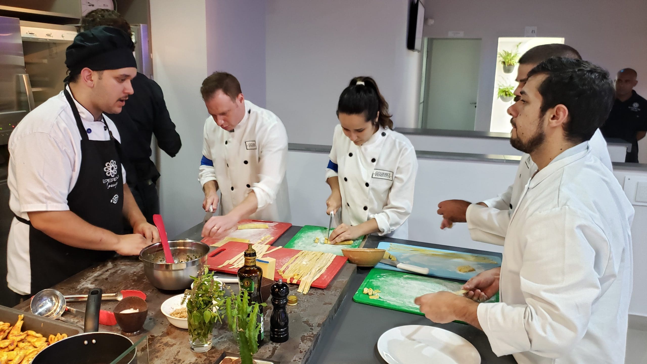 Após as instruções, os participantes vestiram os dólmãns e se dividiram em três grupos para produzir a entrada, o prato principal e a sobremesa, exatamente como acontece em uma cozinha profissional.