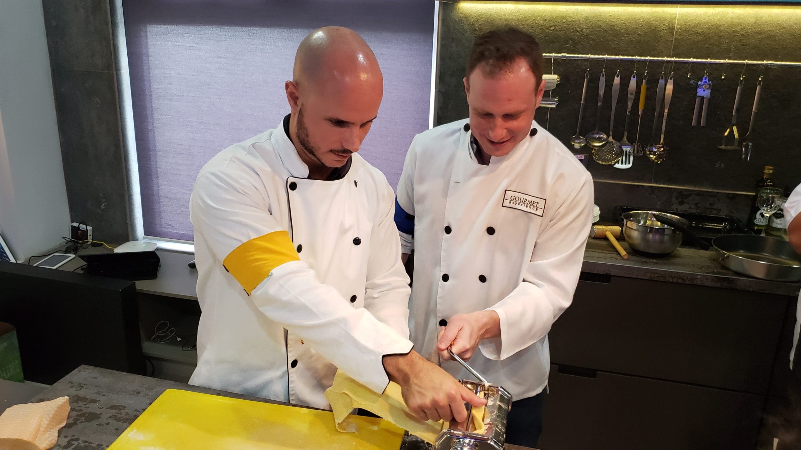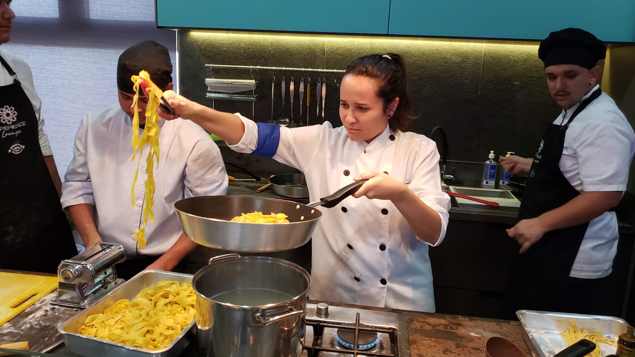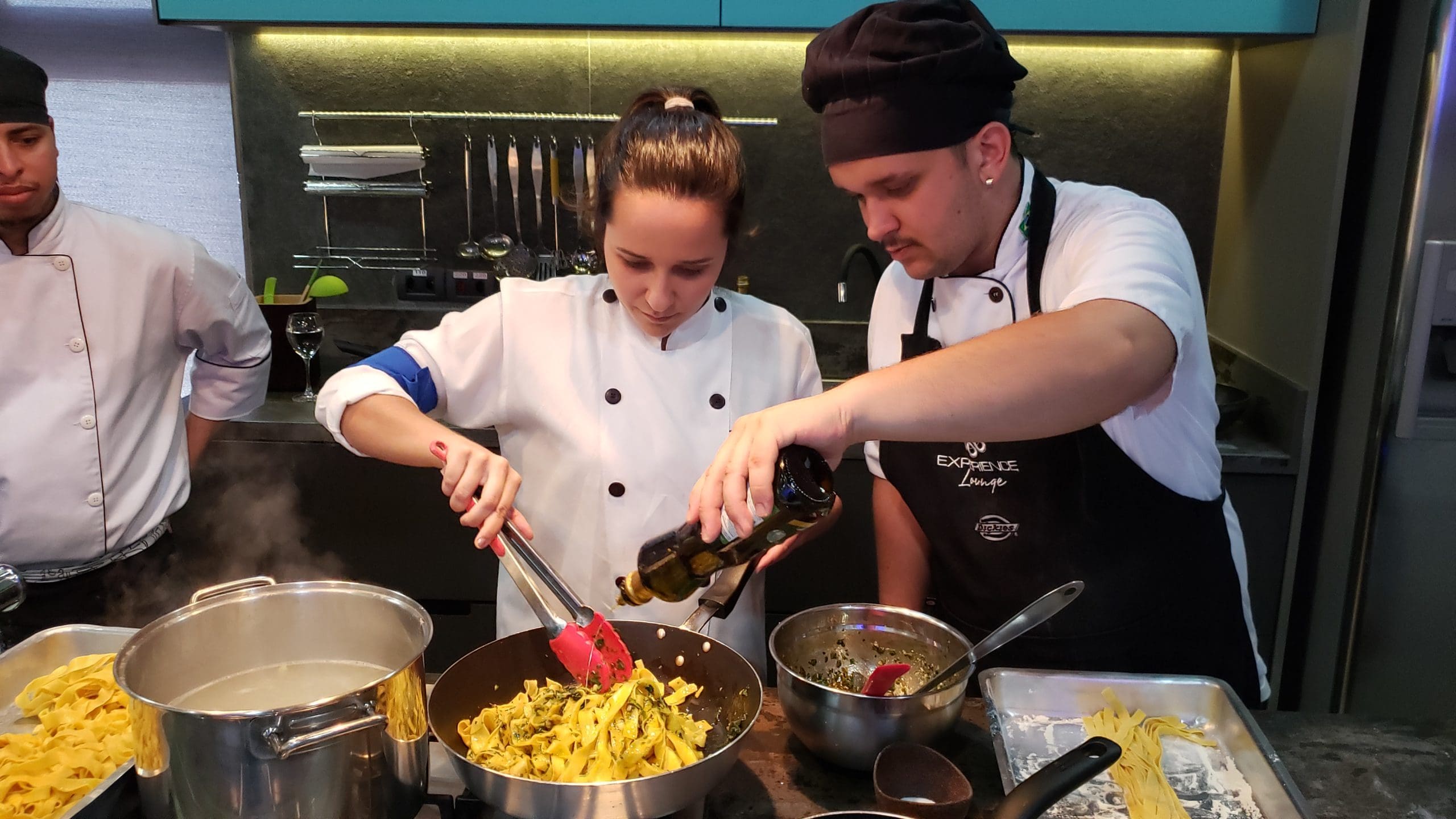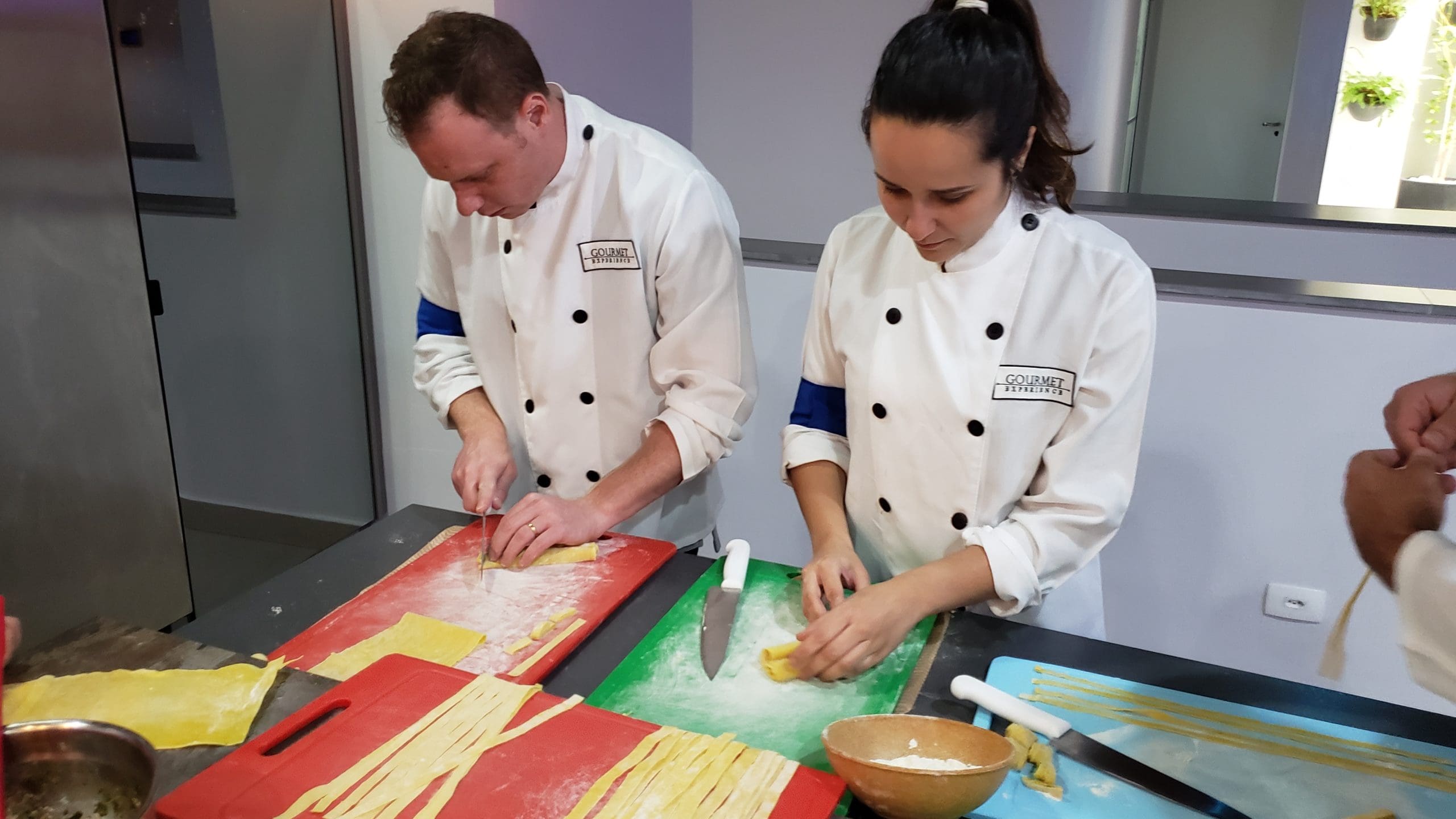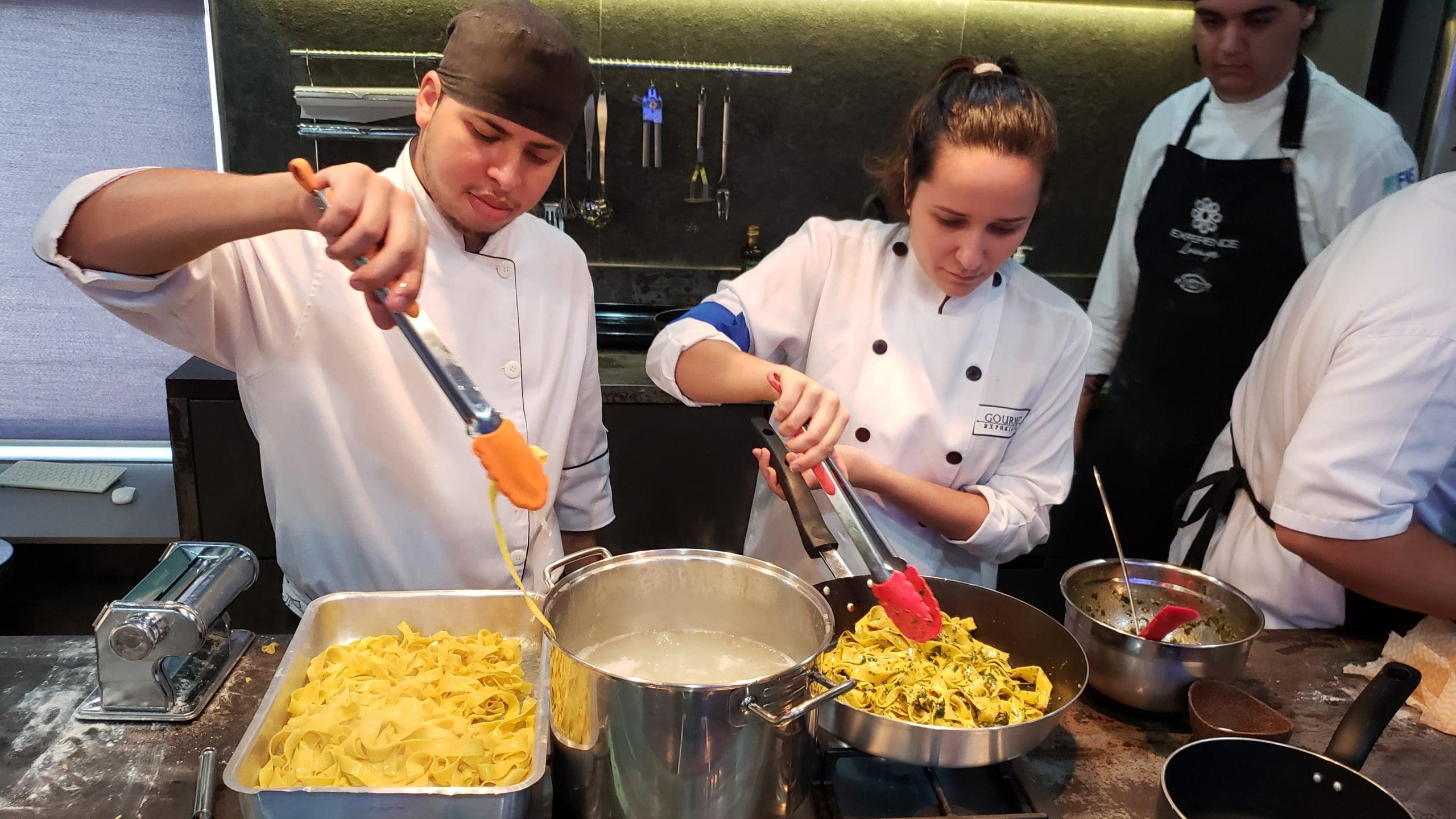 Após as instruções, os participantes vestiram os dólmãns e se dividiram em três grupos para produzir a entrada, o prato principal e a sobremesa, exatamente como acontece em uma cozinha profissional.