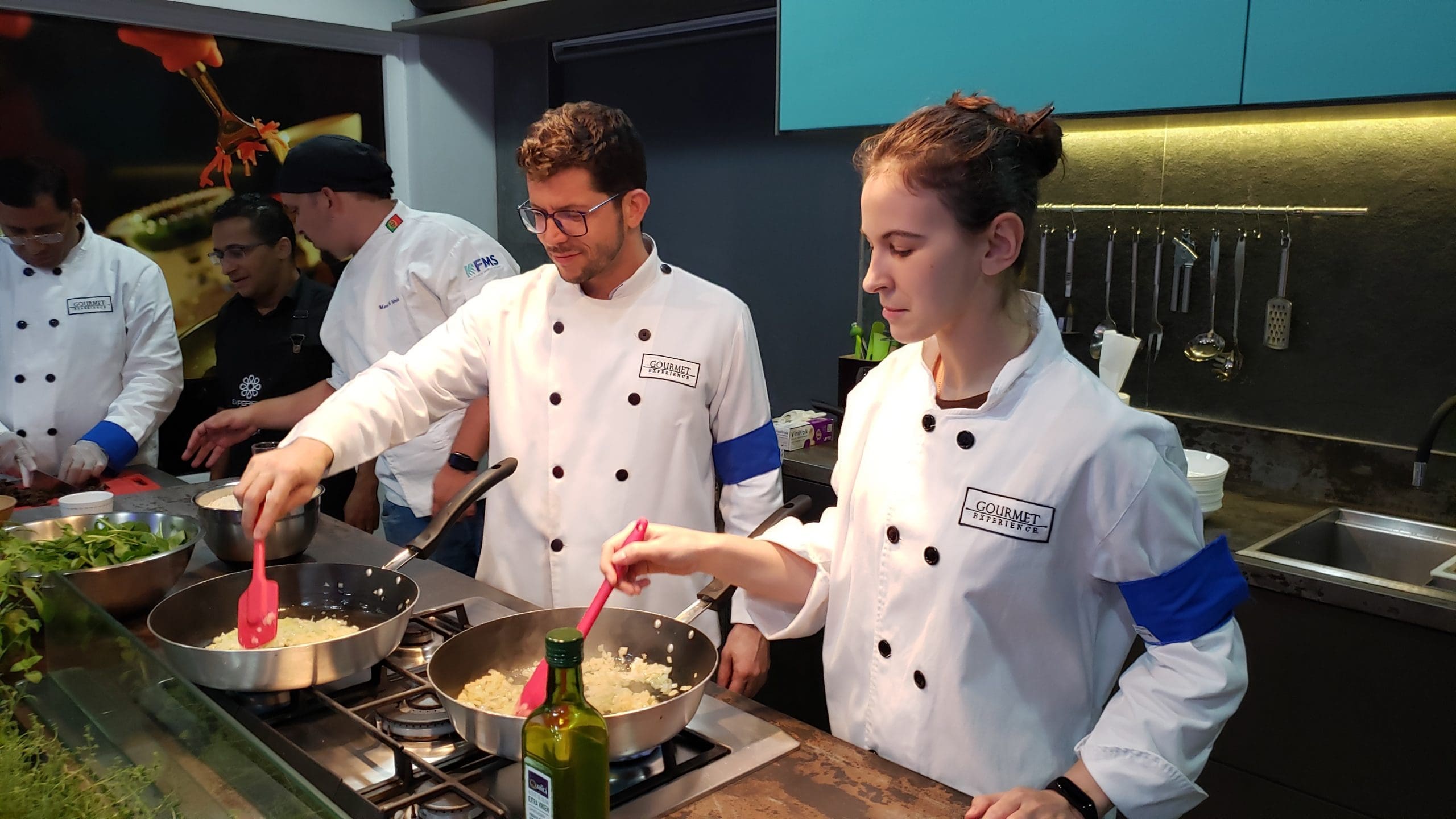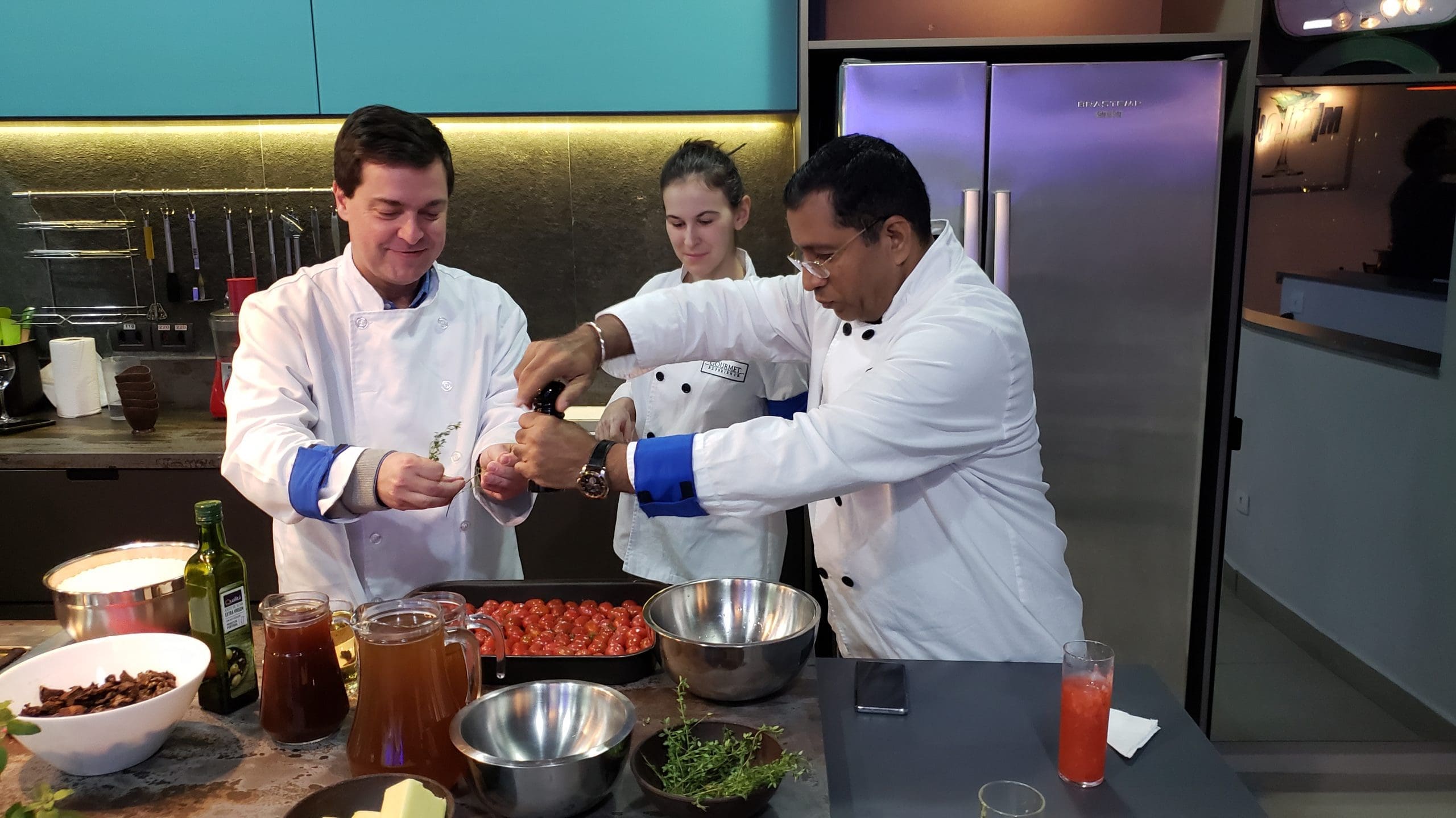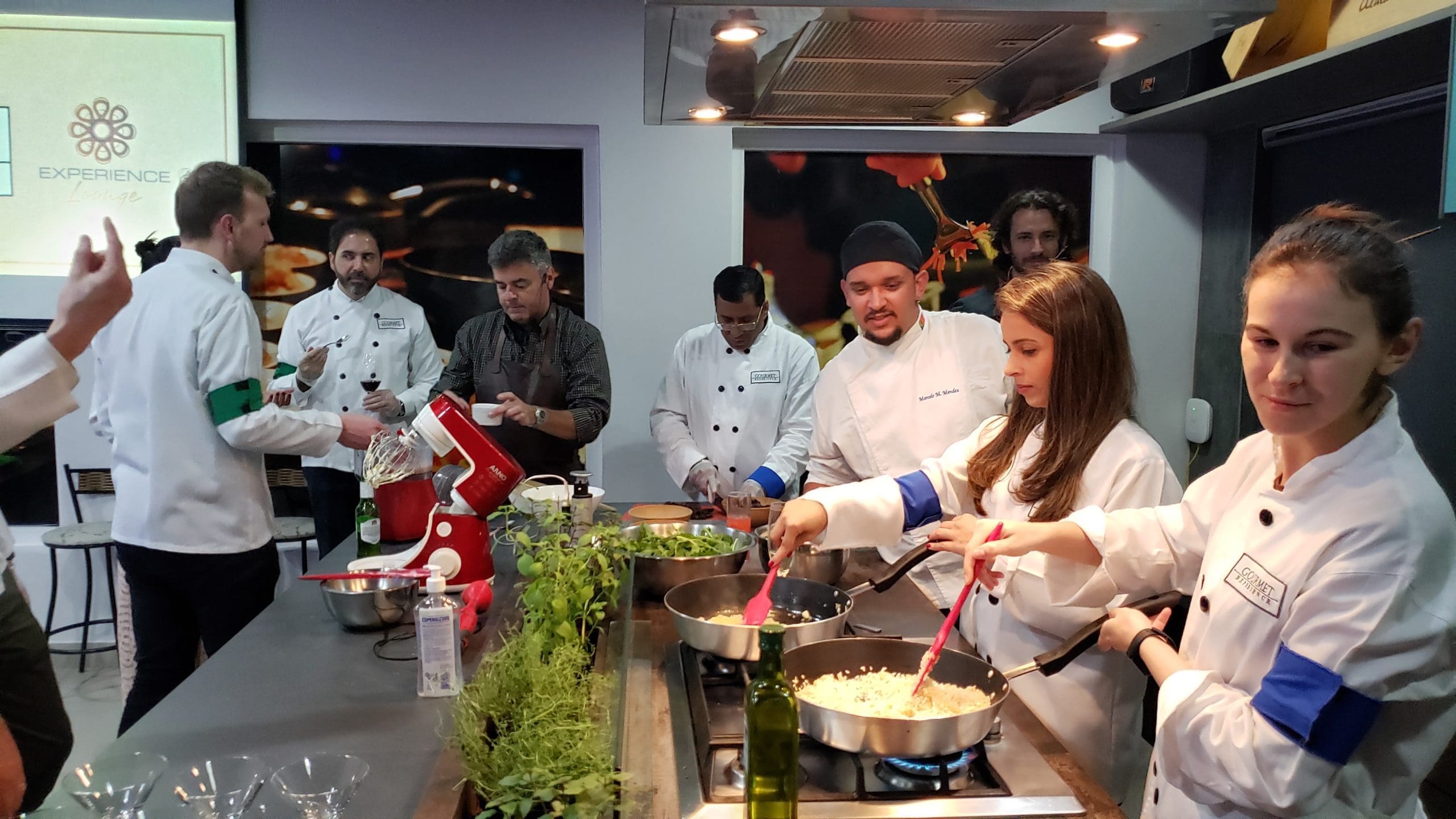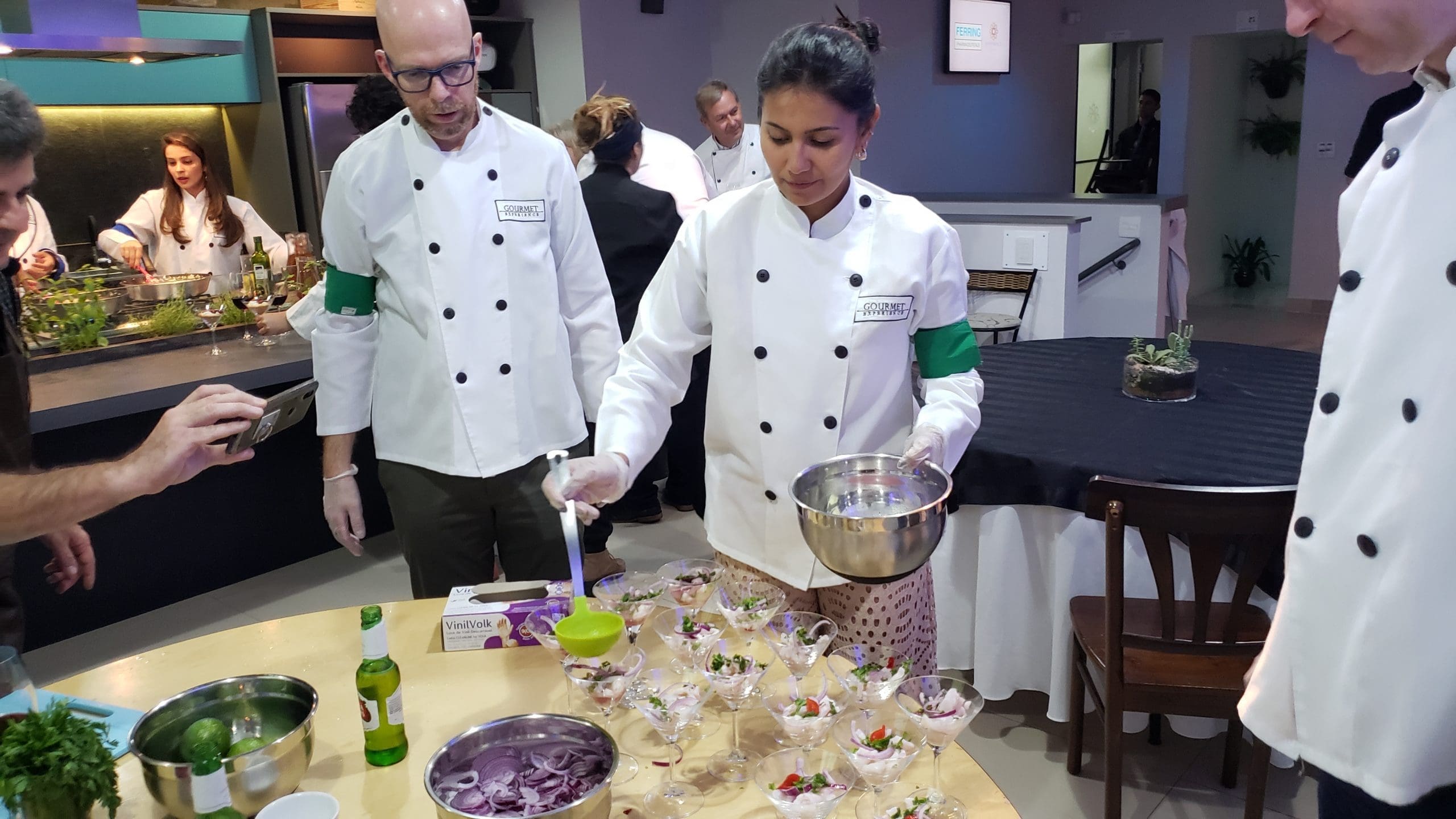 O dia foi repleto de informações e reuniões importantes, mas também teve um momento especial de desenvolvimento e integração de equipe. Os 18 executivos foram recepcionados com um saboroso coquetel e um bar de caipirinhas. Ao serem apresentados para o chef de cozinha Fred Paim, entenderam qual seria a dinâmica e ficaram surpresos ao descobrirem que preparariam o próprio jantar, composto da entrada, prato principal e sobremesa, todos vestindo o seu próprio dólmã.