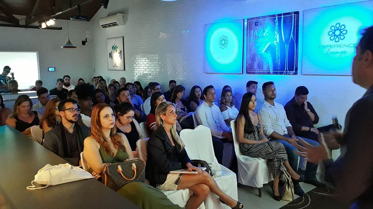 Após este momento inicial de interação, os convidados foram direcionados ao nosso lounge que estava organizado em formato de auditório. Nesse momento a empresa iniciou uma apresentação, abordando os principais acontecimentos de 2018 e os desafios para 2019. Ao final da apresentação o cliente explicou aos convidados como seria a dinâmica e os dividiu em 5 grupos.
