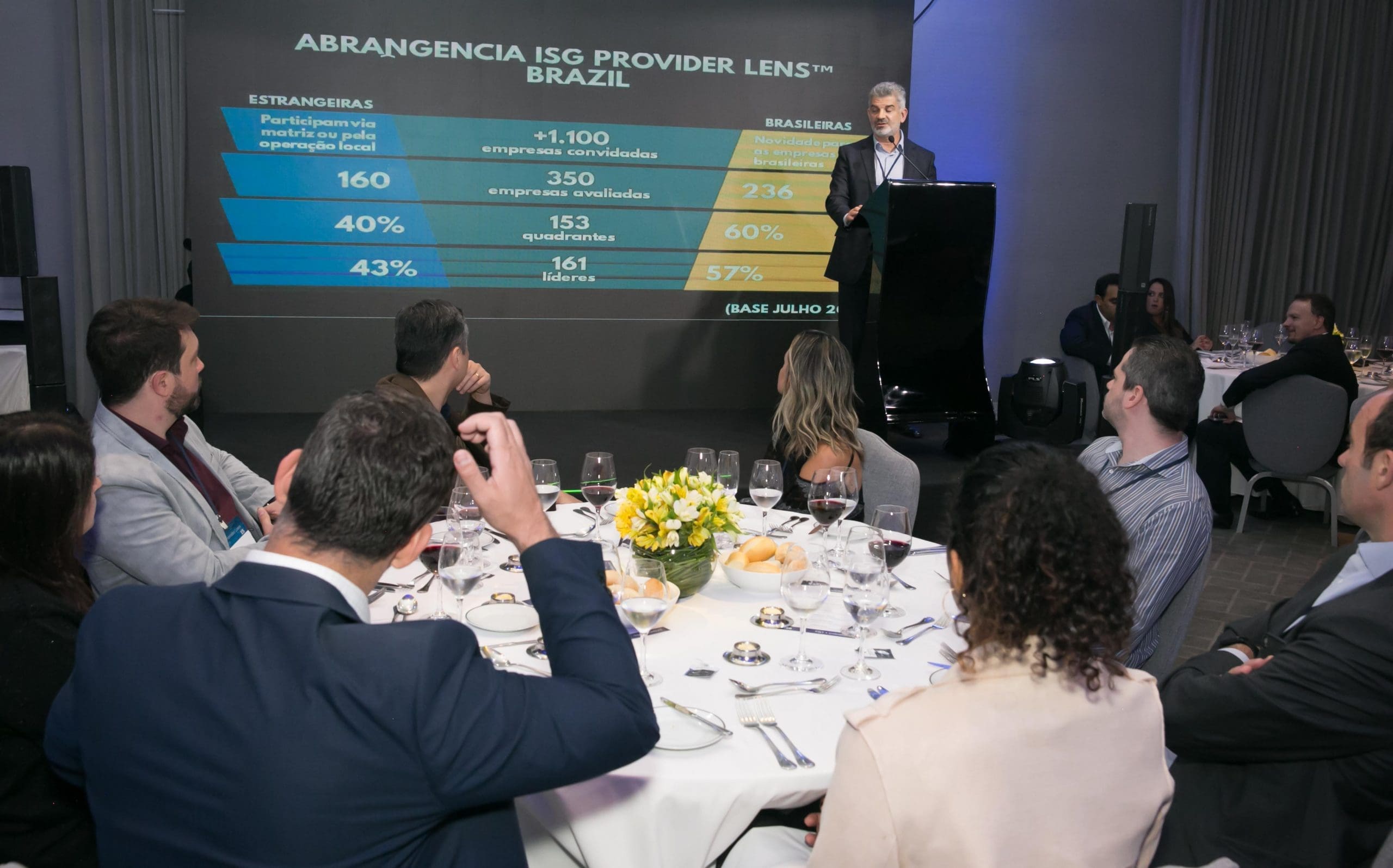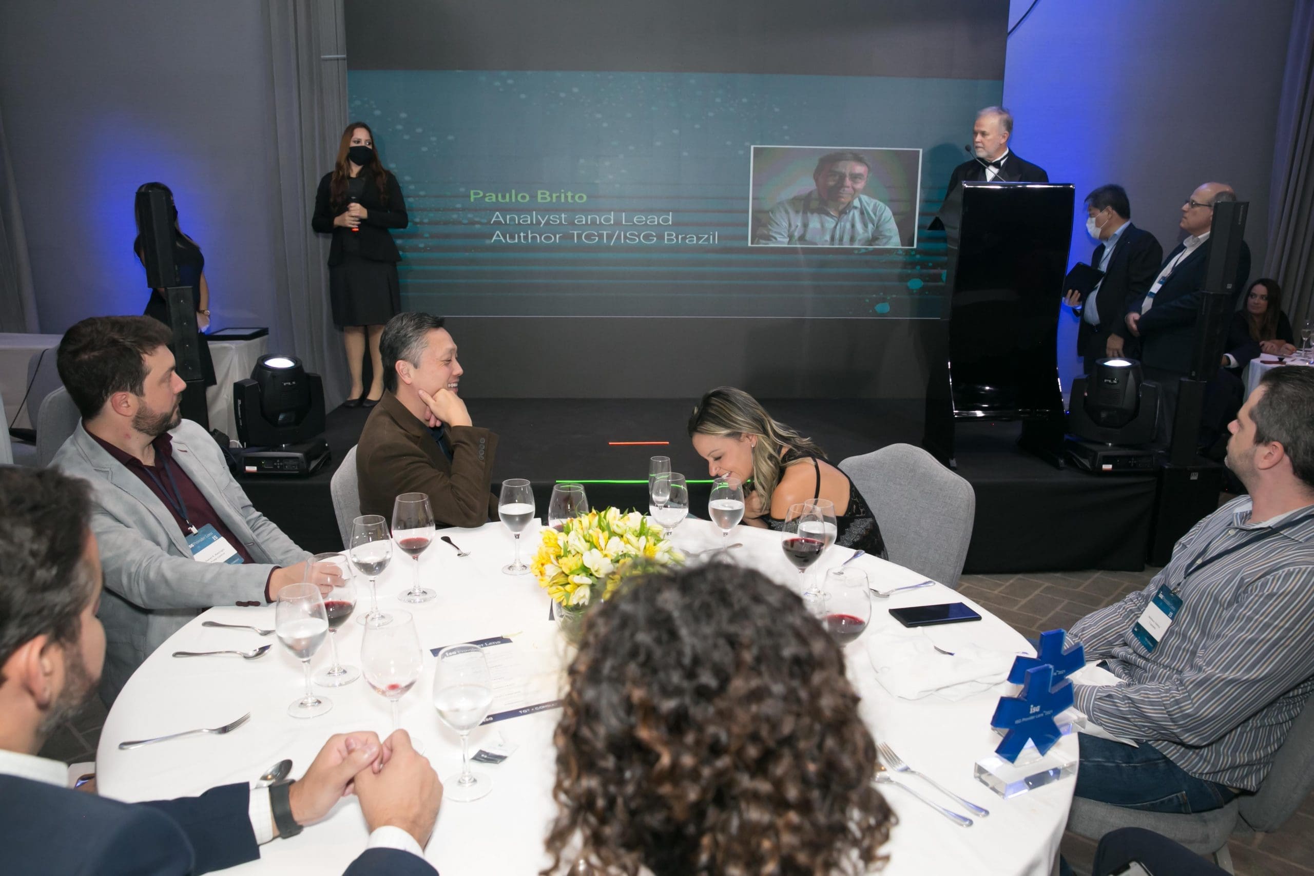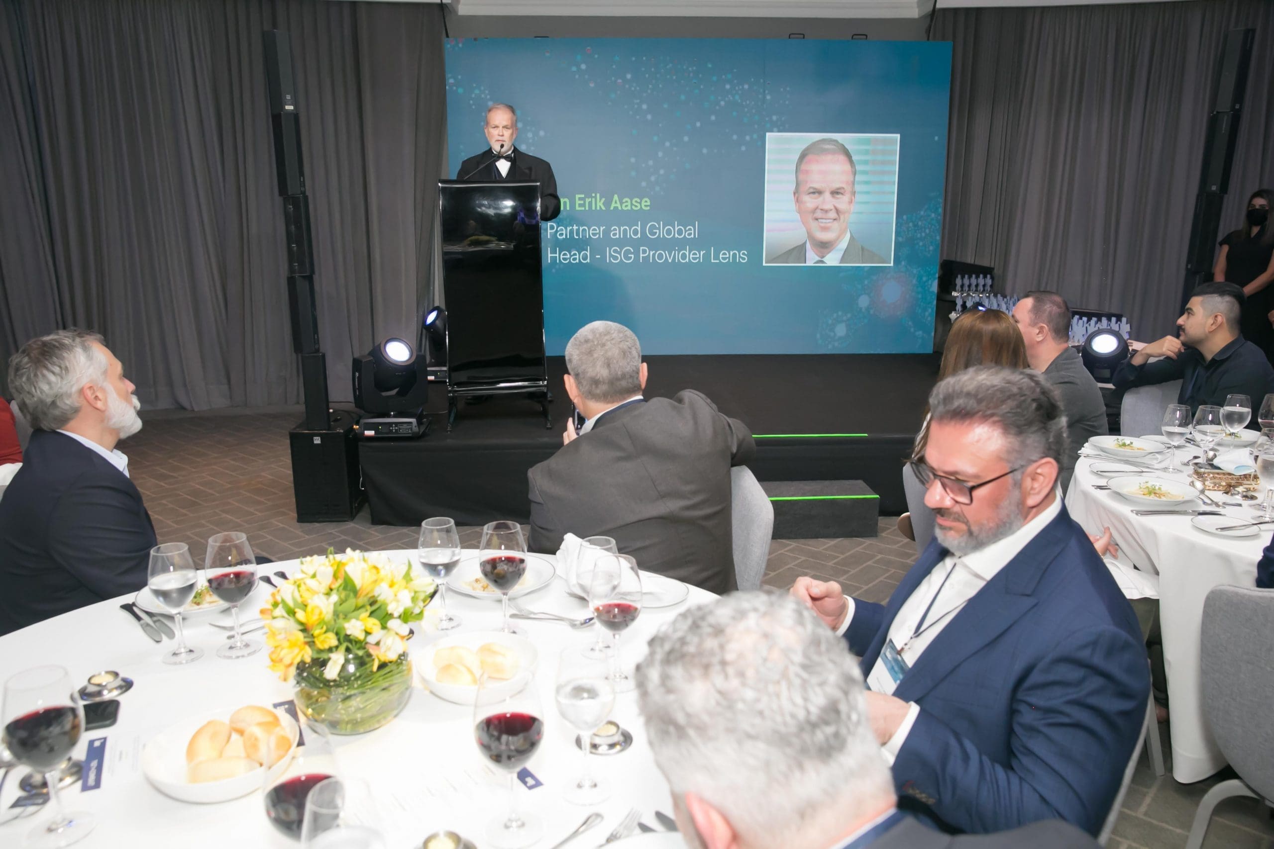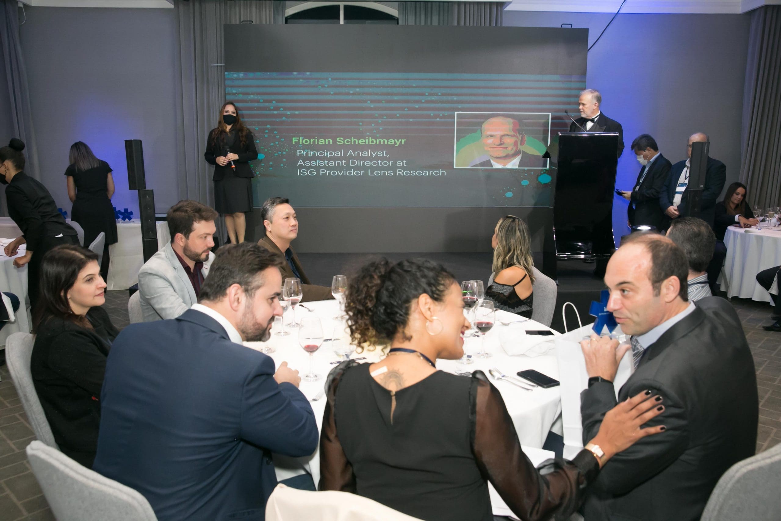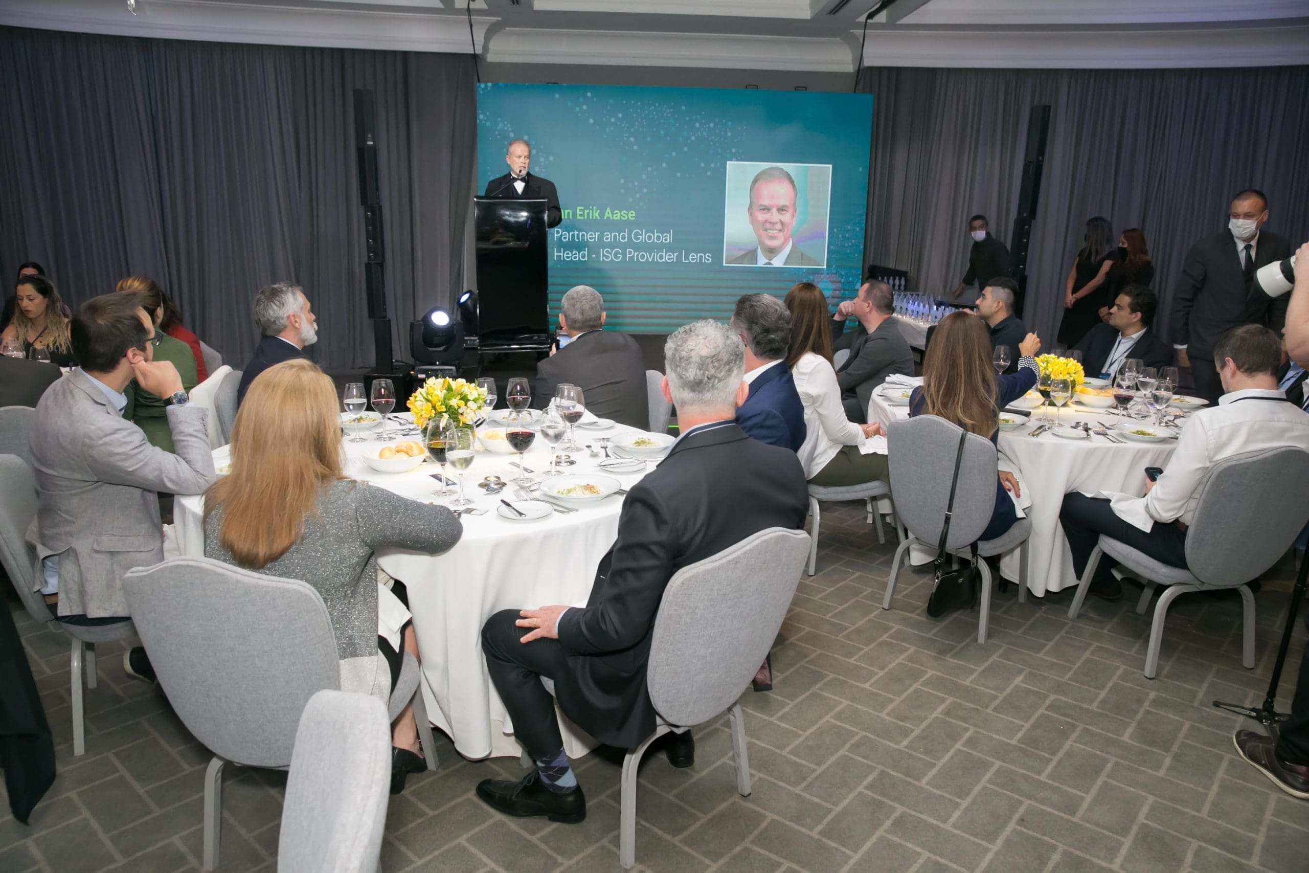 Logo após todos foram convidados a sentarem em suas mesas para acompanhar a premiação que contou com a condução de Jan Erik Aase – Líder Global da  ISG Provider Lens™ que veio ao Brasil especialmente para o evento e convidou ao palco os representantes das empresas para receberem seus prêmios.