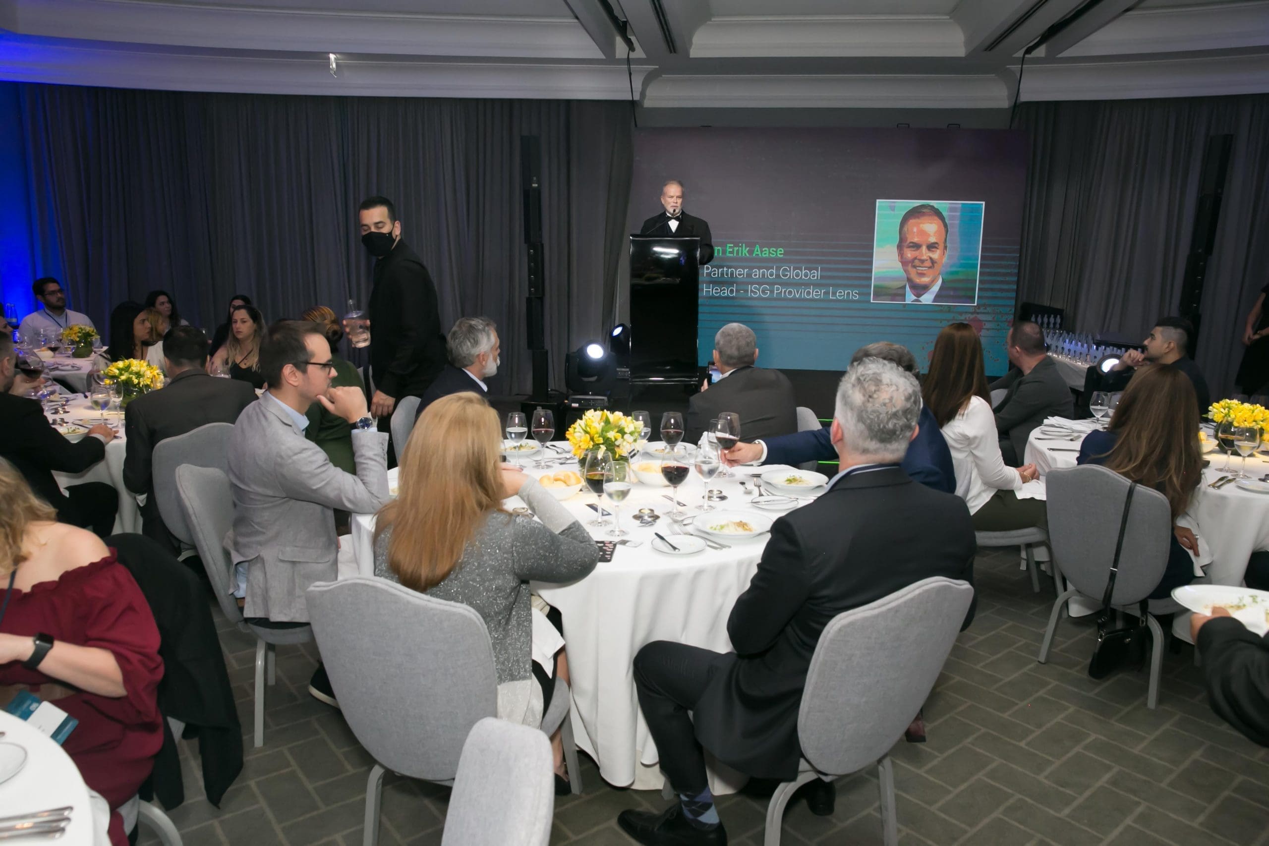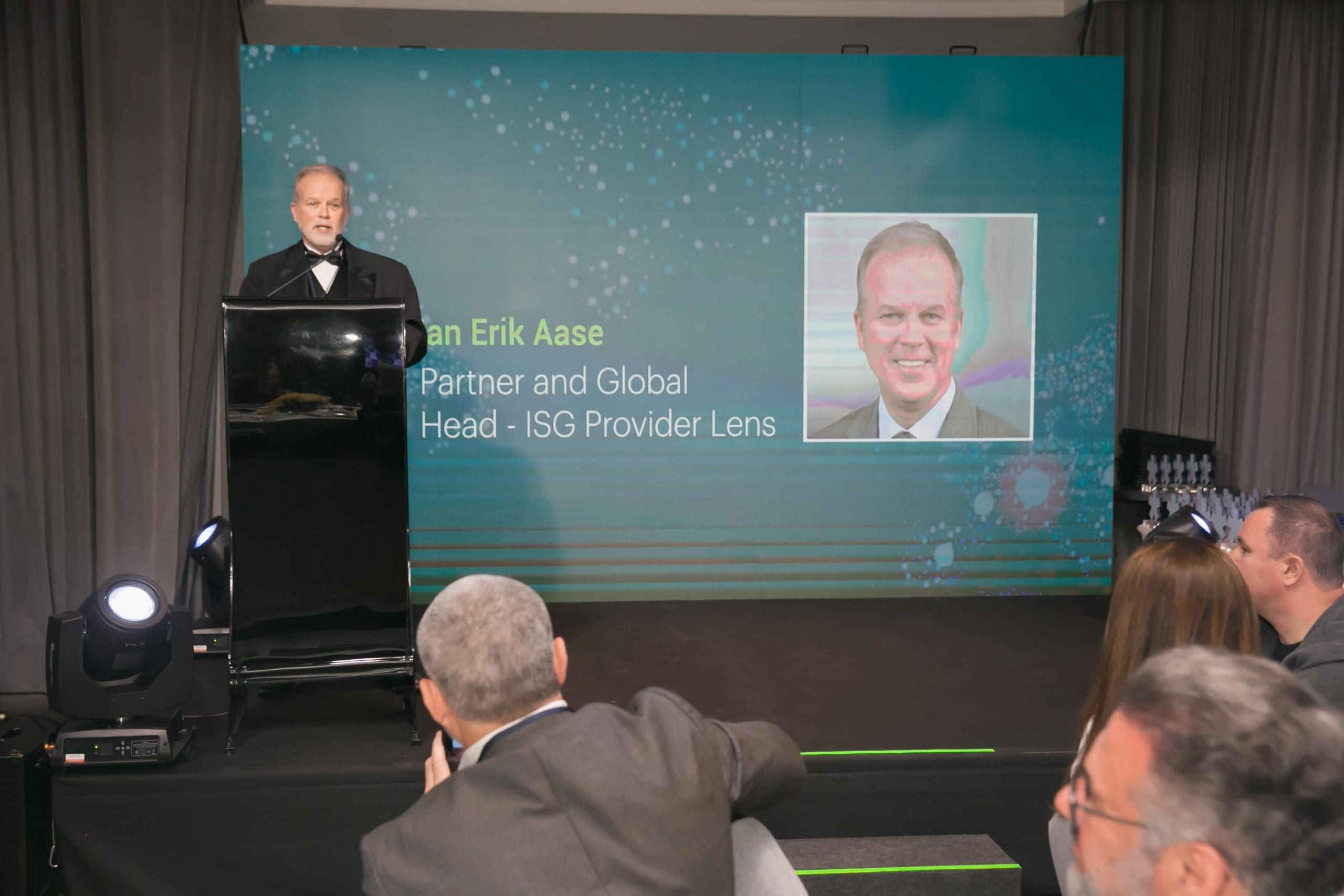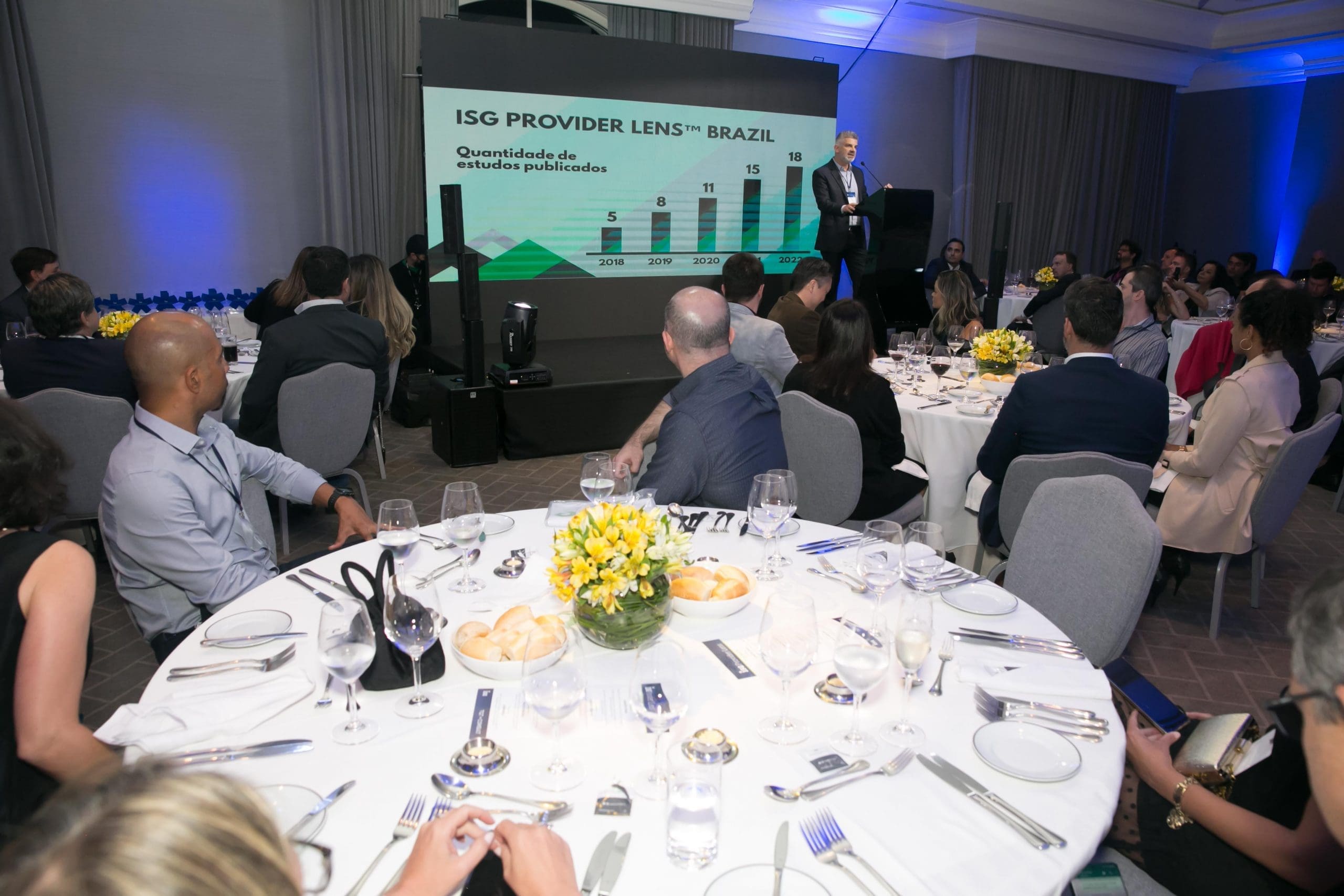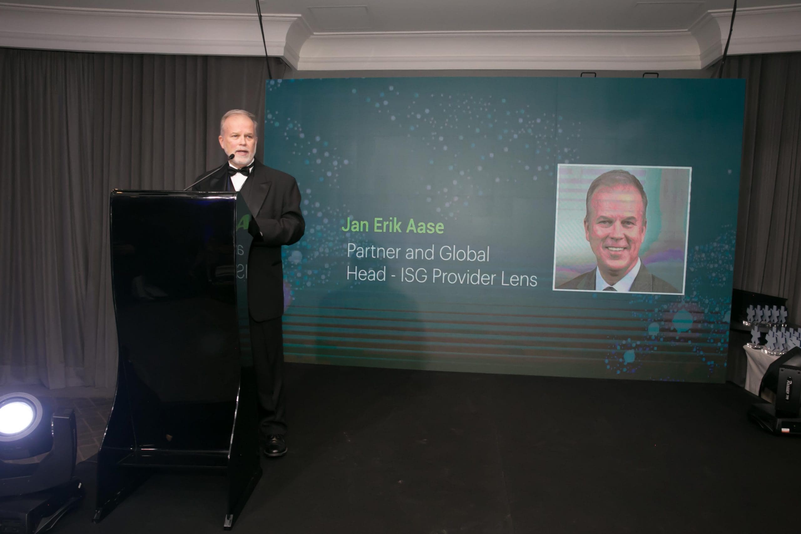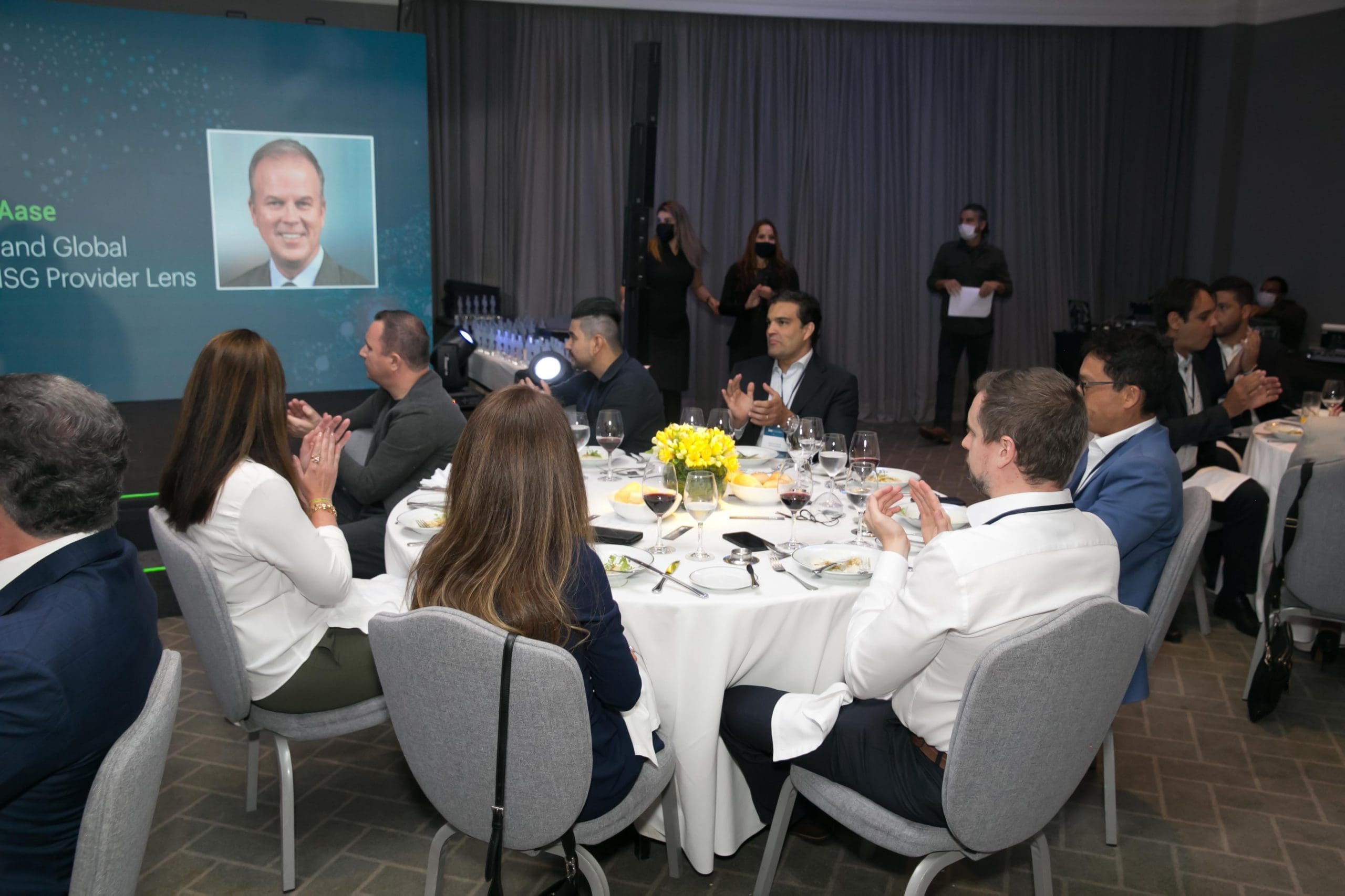 Logo após todos foram convidados a sentarem em suas mesas para acompanhar a premiação que contou com a condução de Jan Erik Aase – Líder Global da  ISG Provider Lens™ que veio ao Brasil especialmente para o evento e convidou ao palco os representantes das empresas para receberem seus prêmios.
