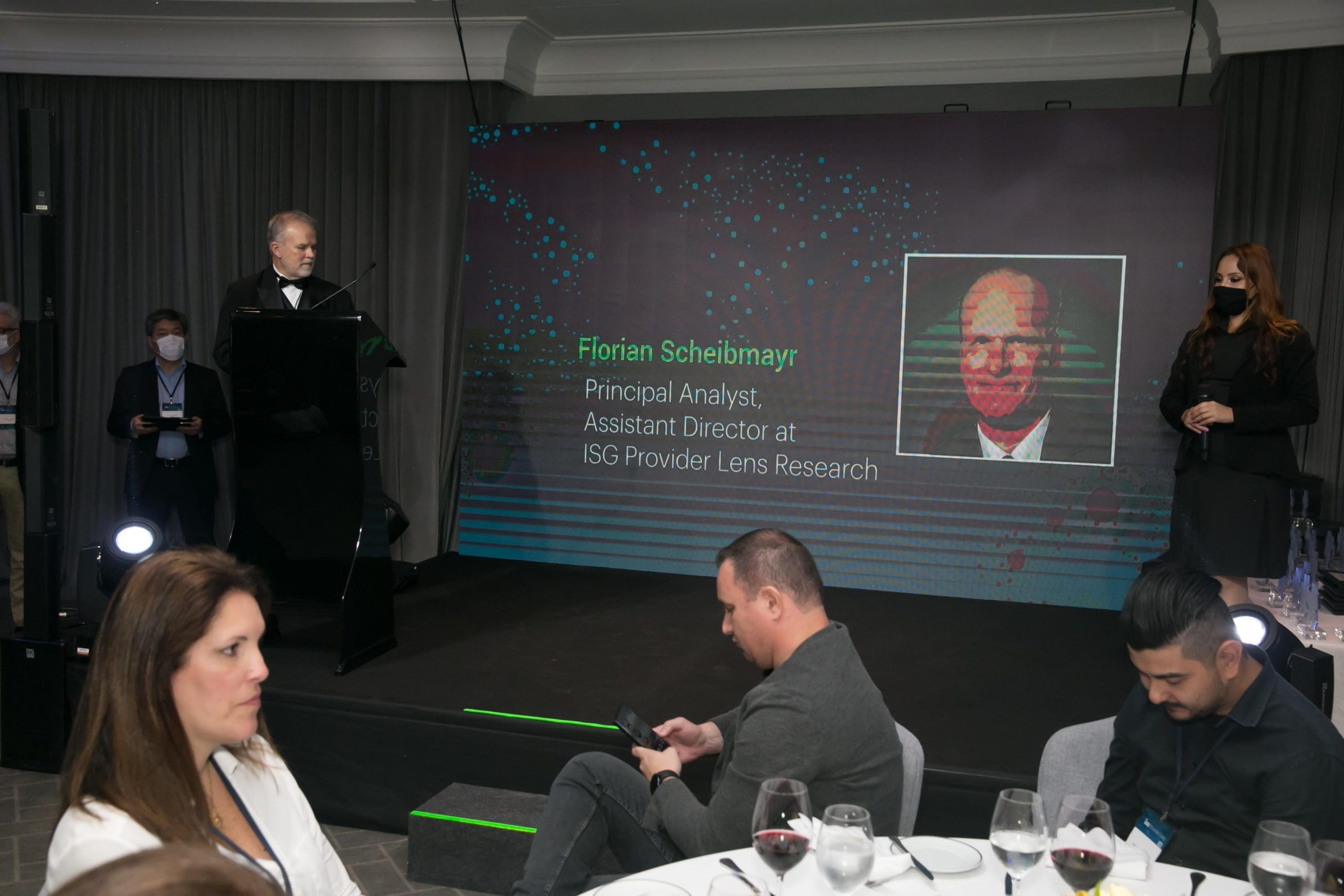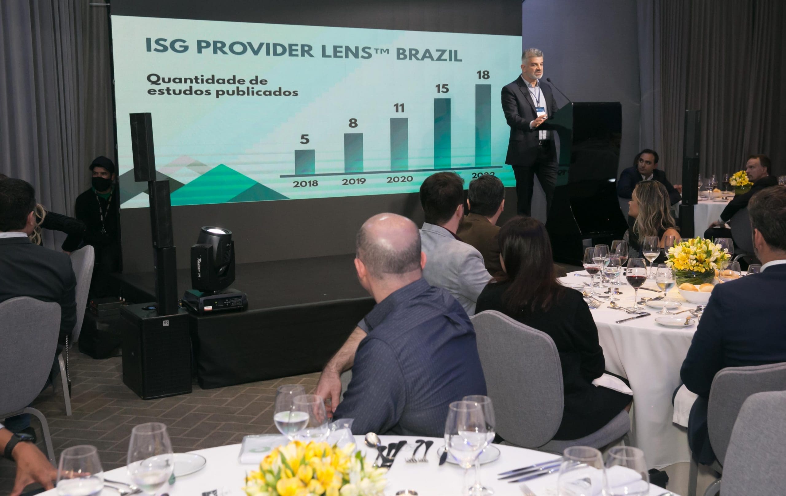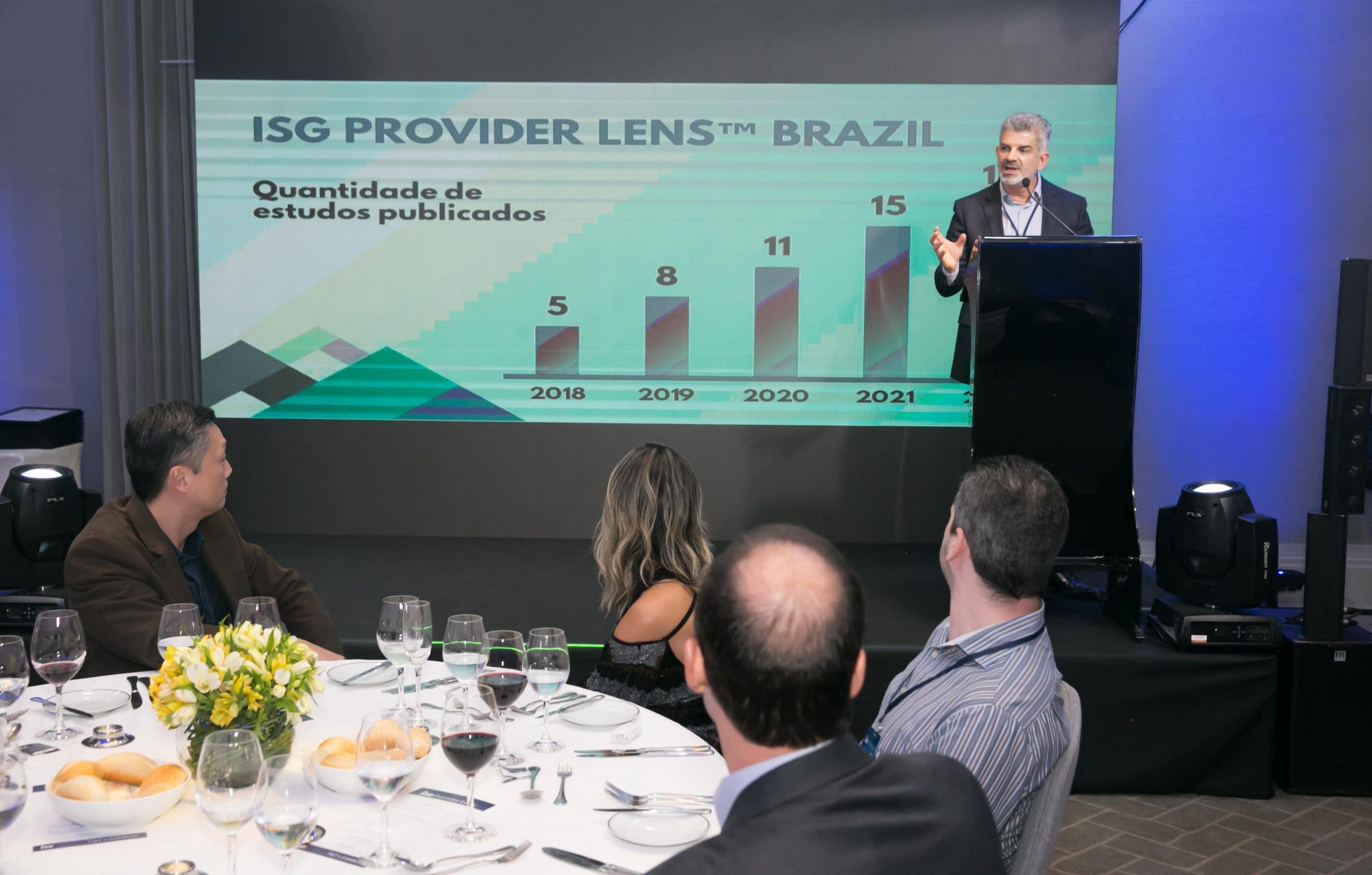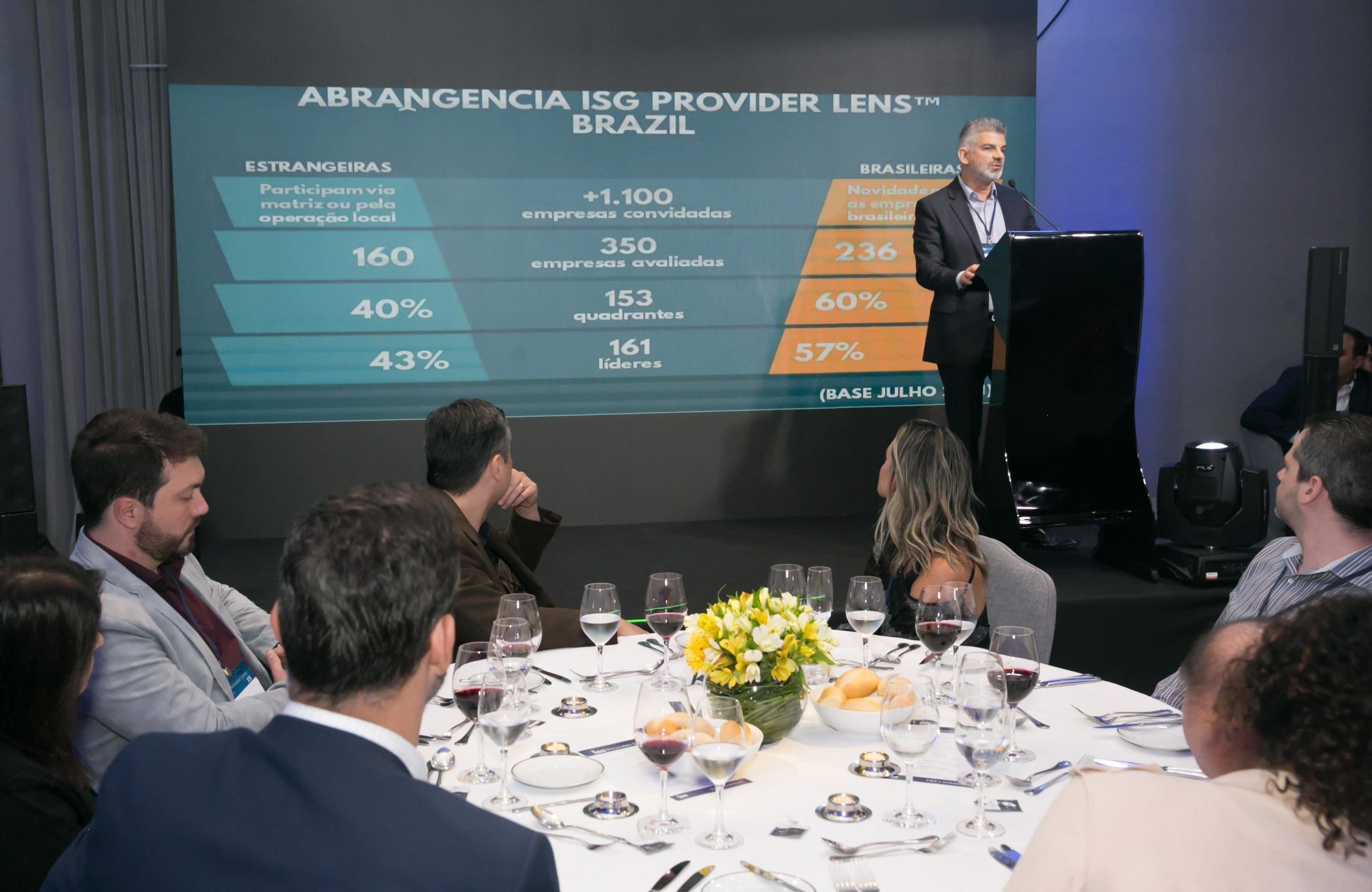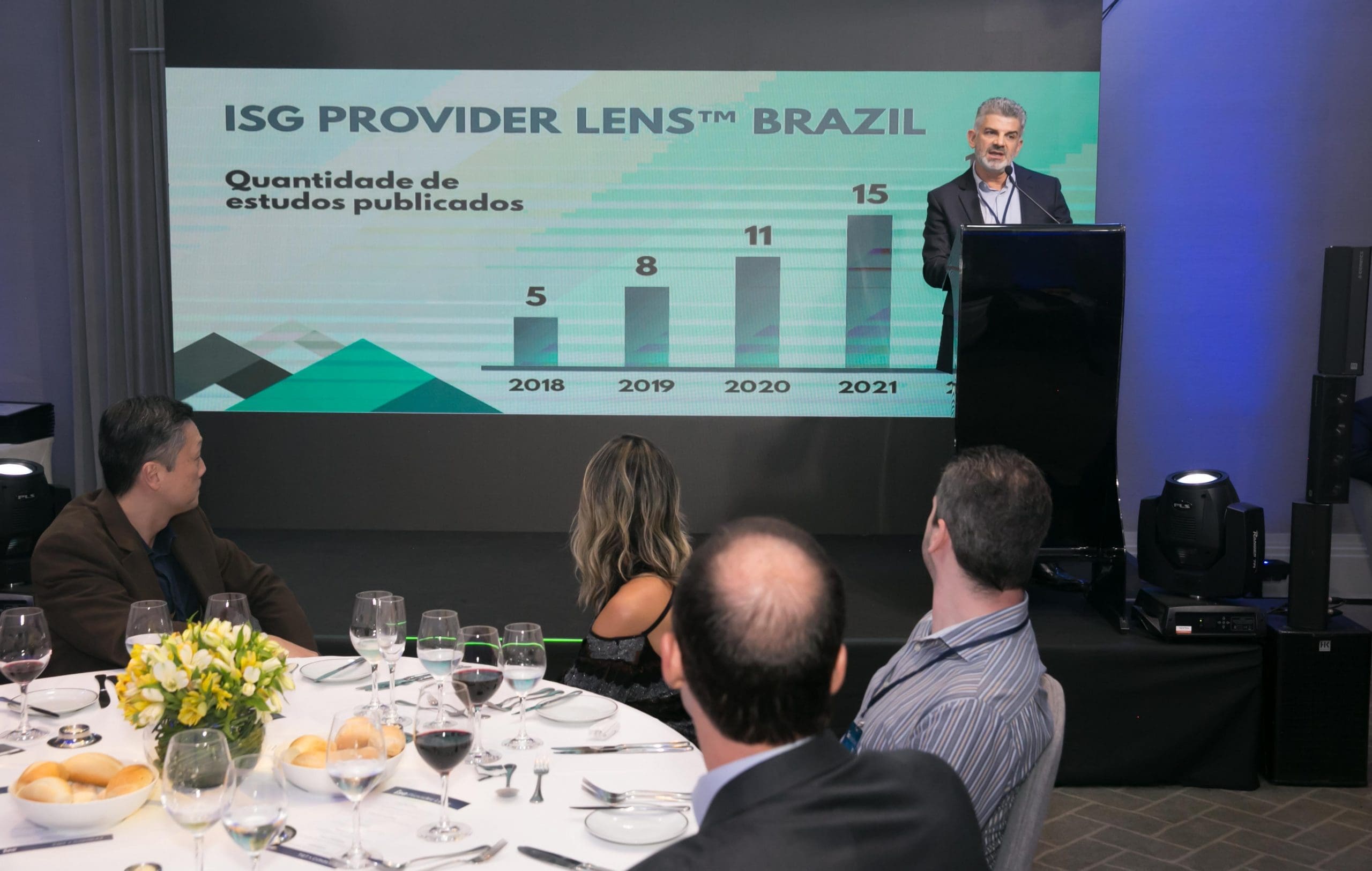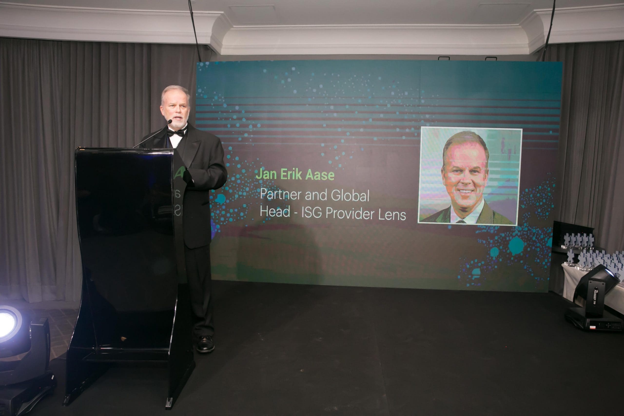 Logo após todos foram convidados a sentarem em suas mesas para acompanhar a premiação que contou com a condução de Jan Erik Aase – Líder Global da  ISG Provider Lens™ que veio ao Brasil especialmente para o evento e convidou ao palco os representantes das empresas para receberem seus prêmios.