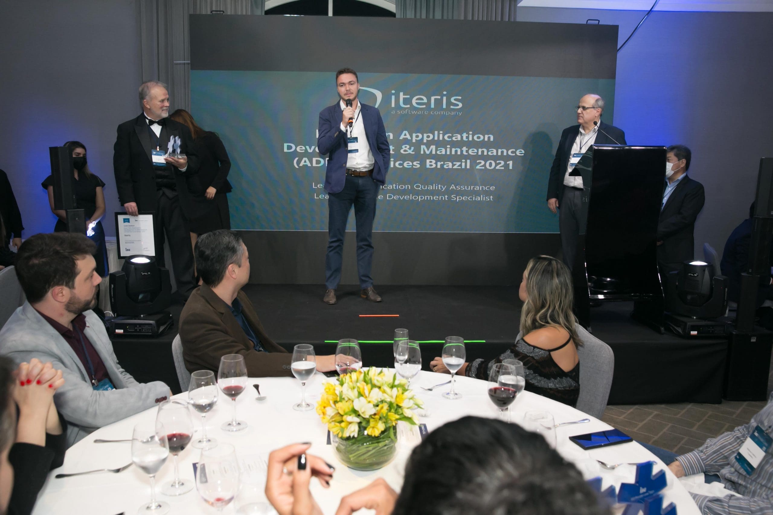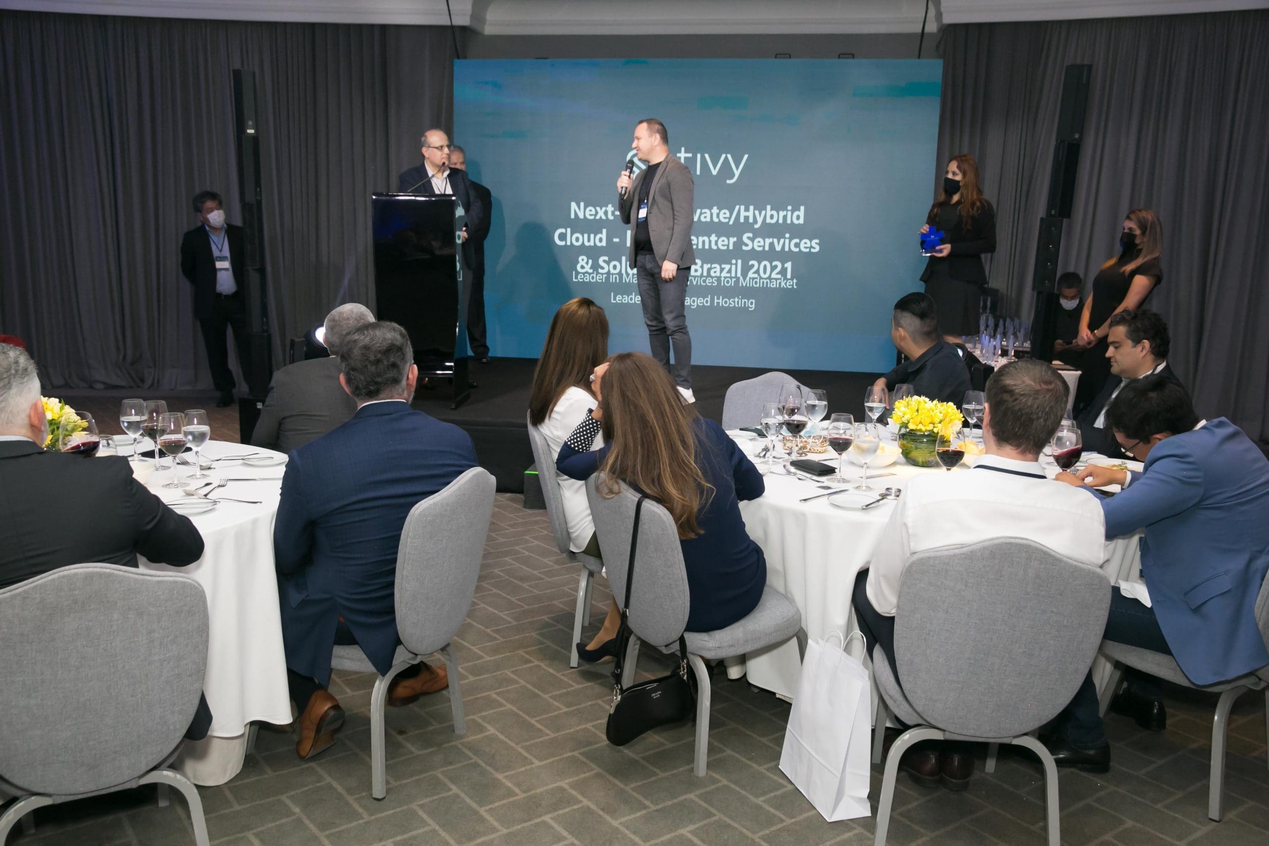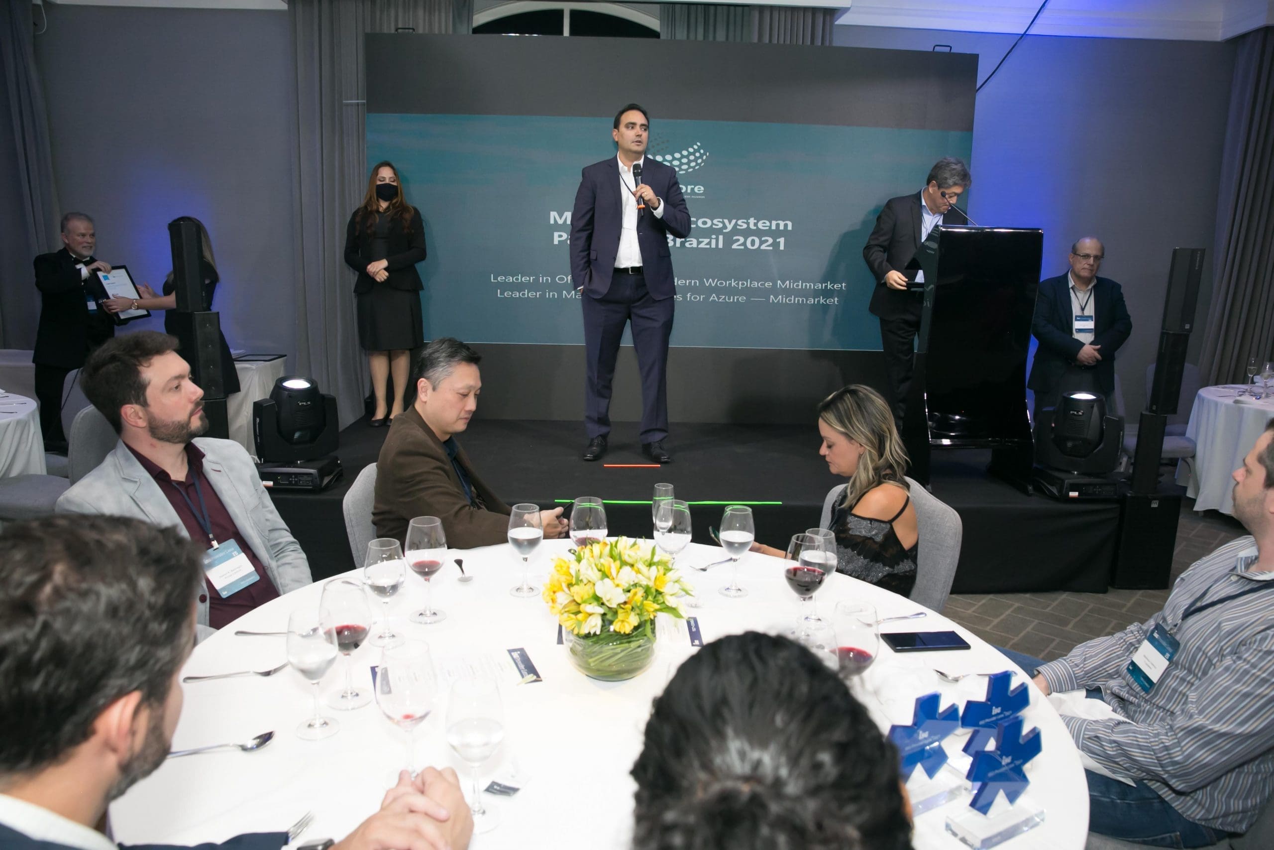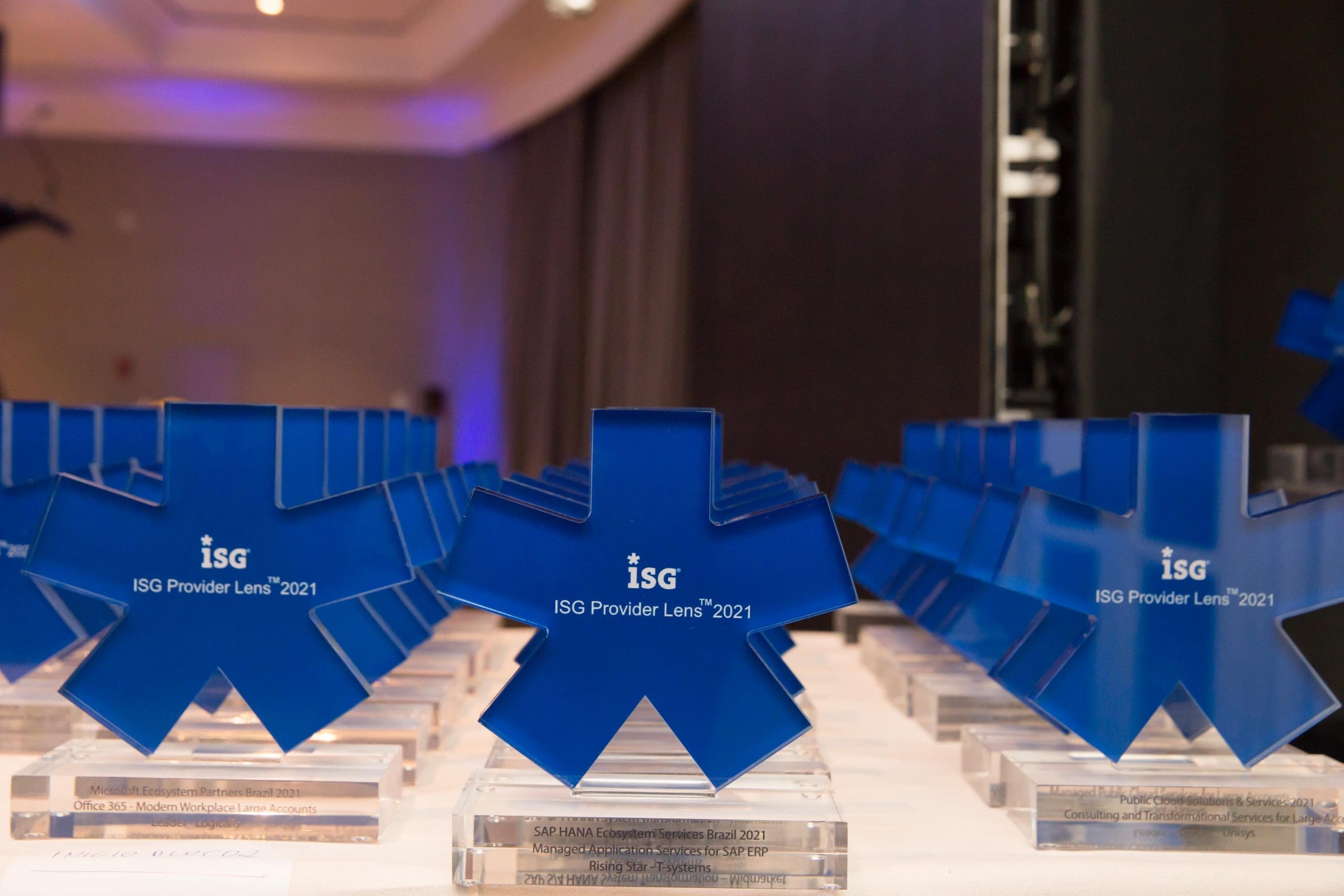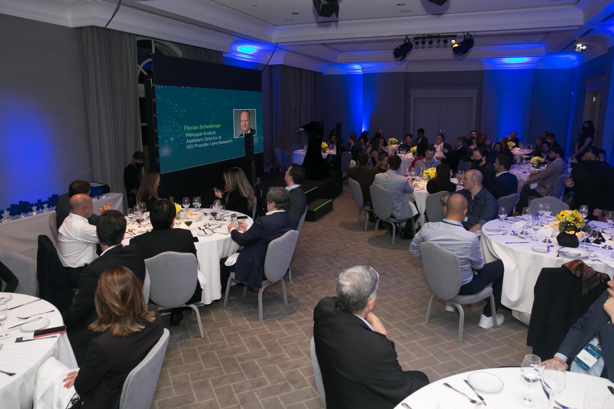 Logo após todos foram convidados a sentarem em suas mesas para acompanhar a premiação que contou com a condução de Jan Erik Aase – Líder Global da  ISG Provider Lens™ que veio ao Brasil especialmente para o evento e convidou ao palco os representantes das empresas para receberem seus prêmios.