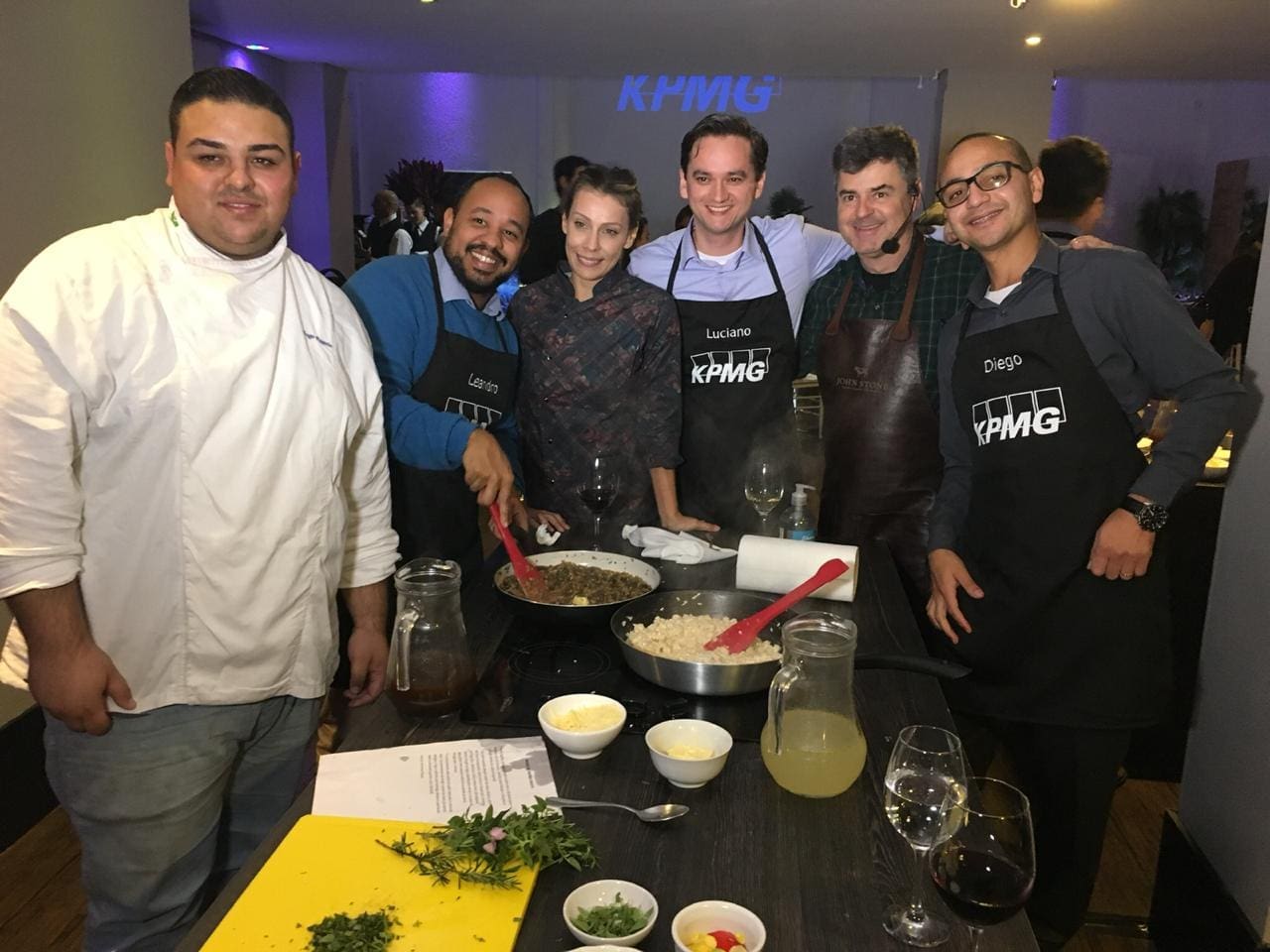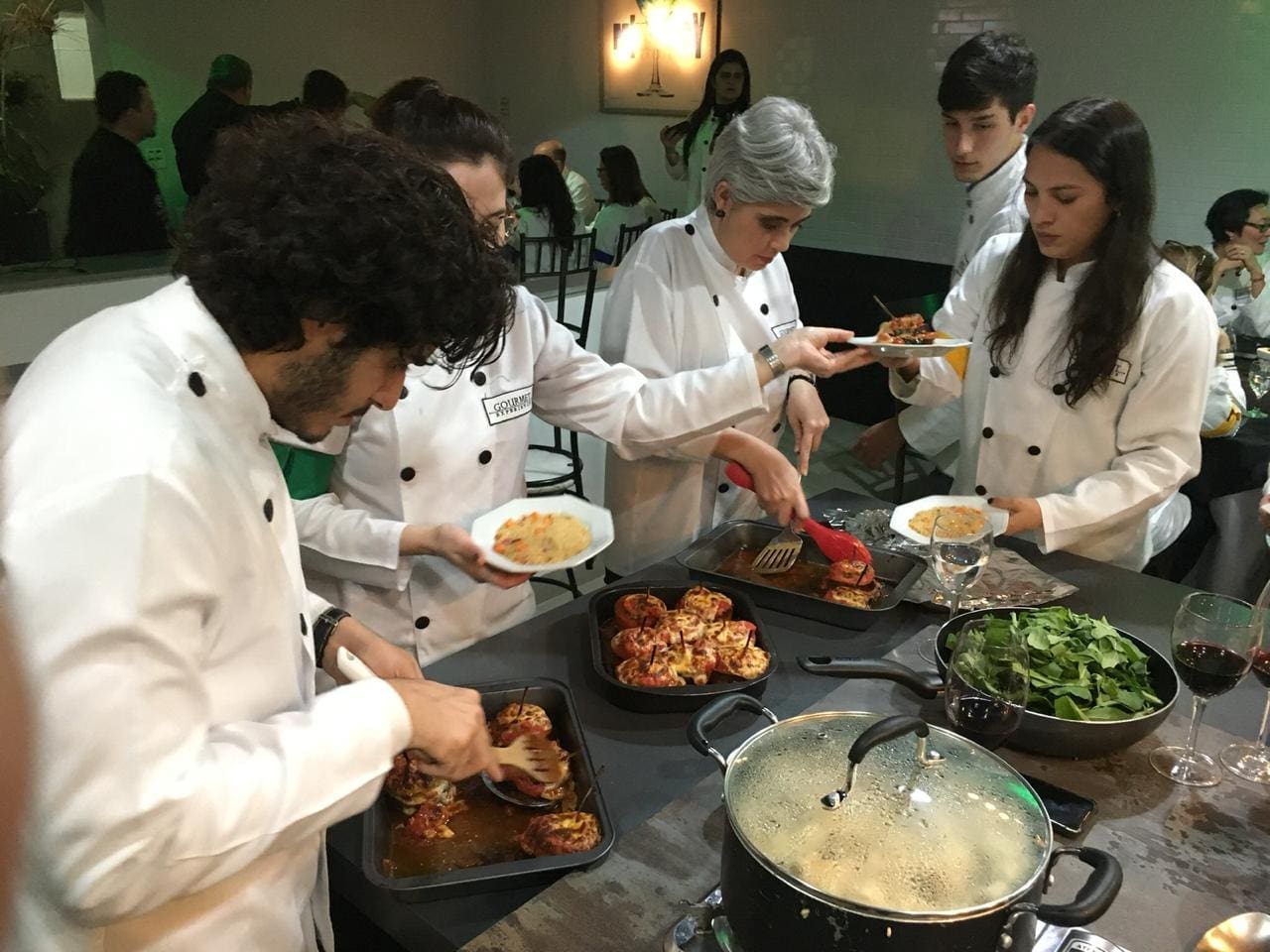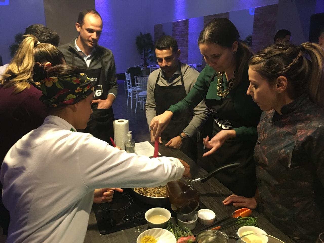 Em seguida, foram divididos em grupos e ocuparam as bancadas gourmet preparadas especialmente para o evento. Cada grupo reproduziu os pratos que os chefs ensinaram e além de preparar o próprio jantar, ainda tiveram que satisfazer o paladar dos chefs Fred Paim e Lu benedicto que avaliaram cada reprodução dos risotos.