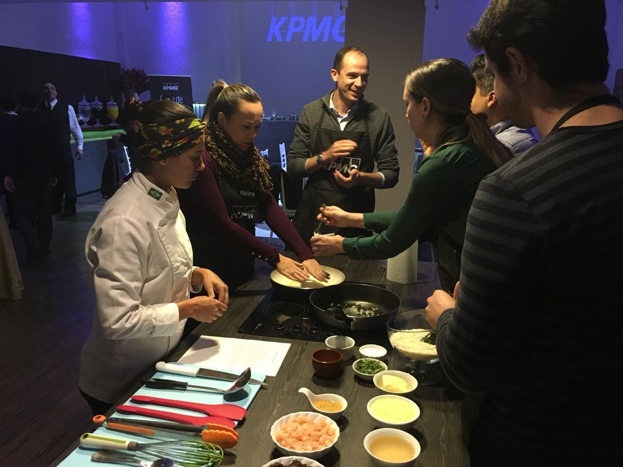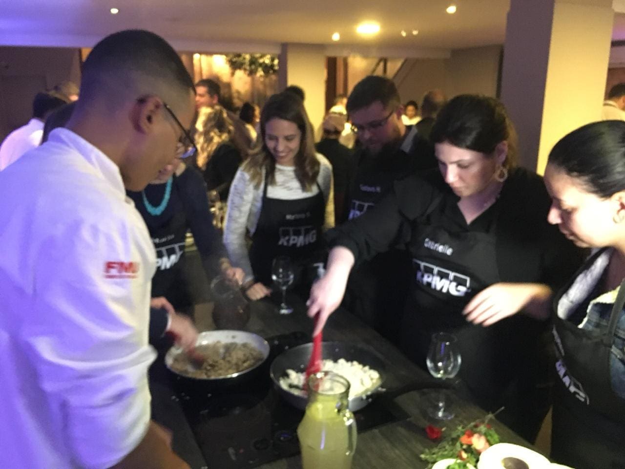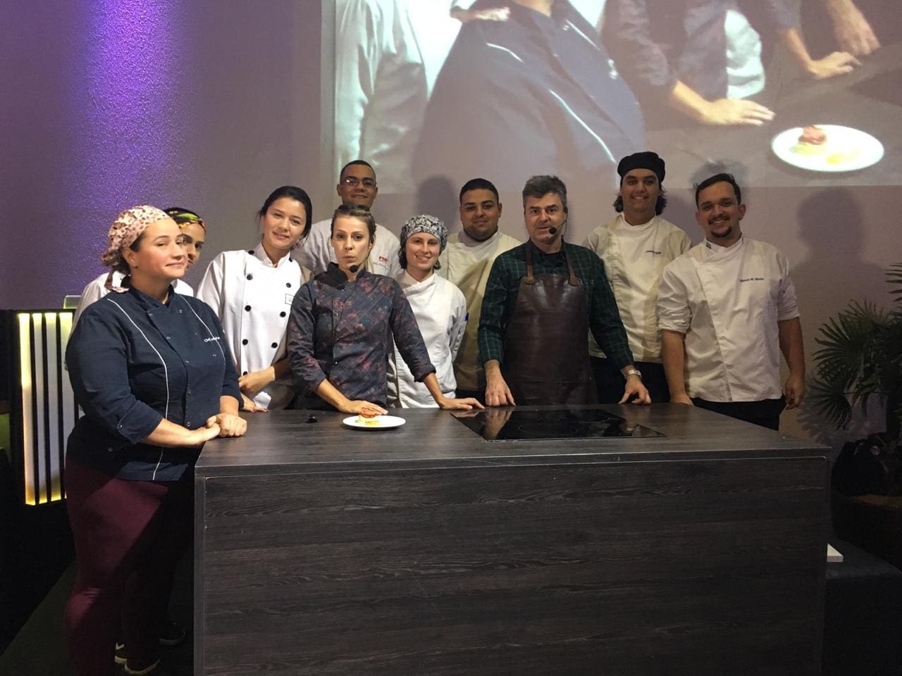 Em seguida, foram divididos em grupos e ocuparam as bancadas gourmet preparadas especialmente para o evento. Cada grupo reproduziu os pratos que os chefs ensinaram e além de preparar o próprio jantar, ainda tiveram que satisfazer o paladar dos chefs Fred Paim e Lu benedicto que avaliaram cada reprodução dos risotos.