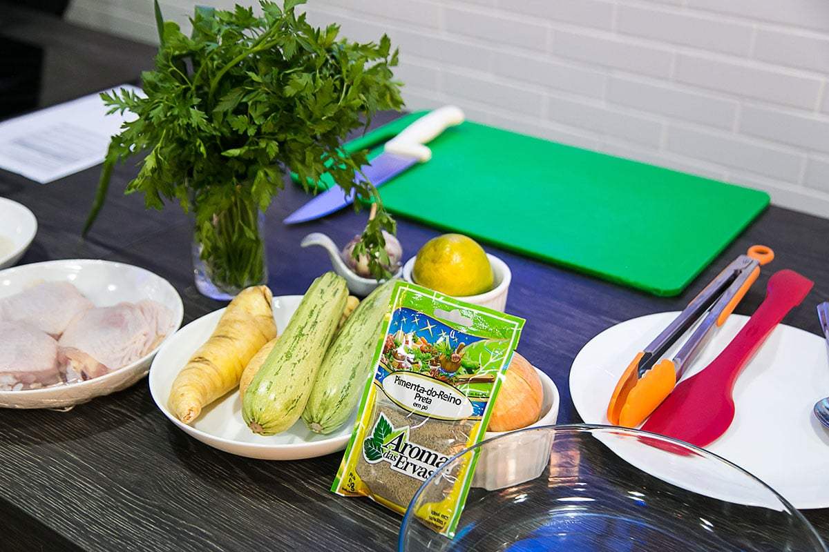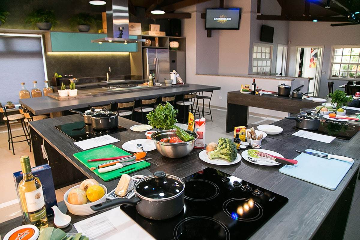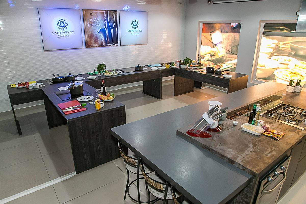 Foram montadas 5 bancadas em nosso espaço gourmet, cada uma delas com um cooktop e diversos produtos frequentemente utilizados pelos profissionais, todas elas de frente para a bancada principal, o que permitiu o desenvolvimento de uma dinâmica similar a uma “sala de espelhos”, onde psicólogos e especialistas puderam observar o comportamento dos participantes.