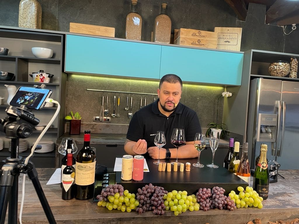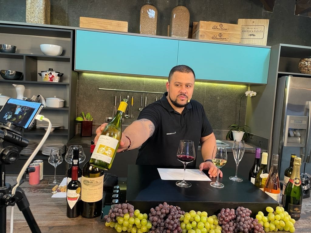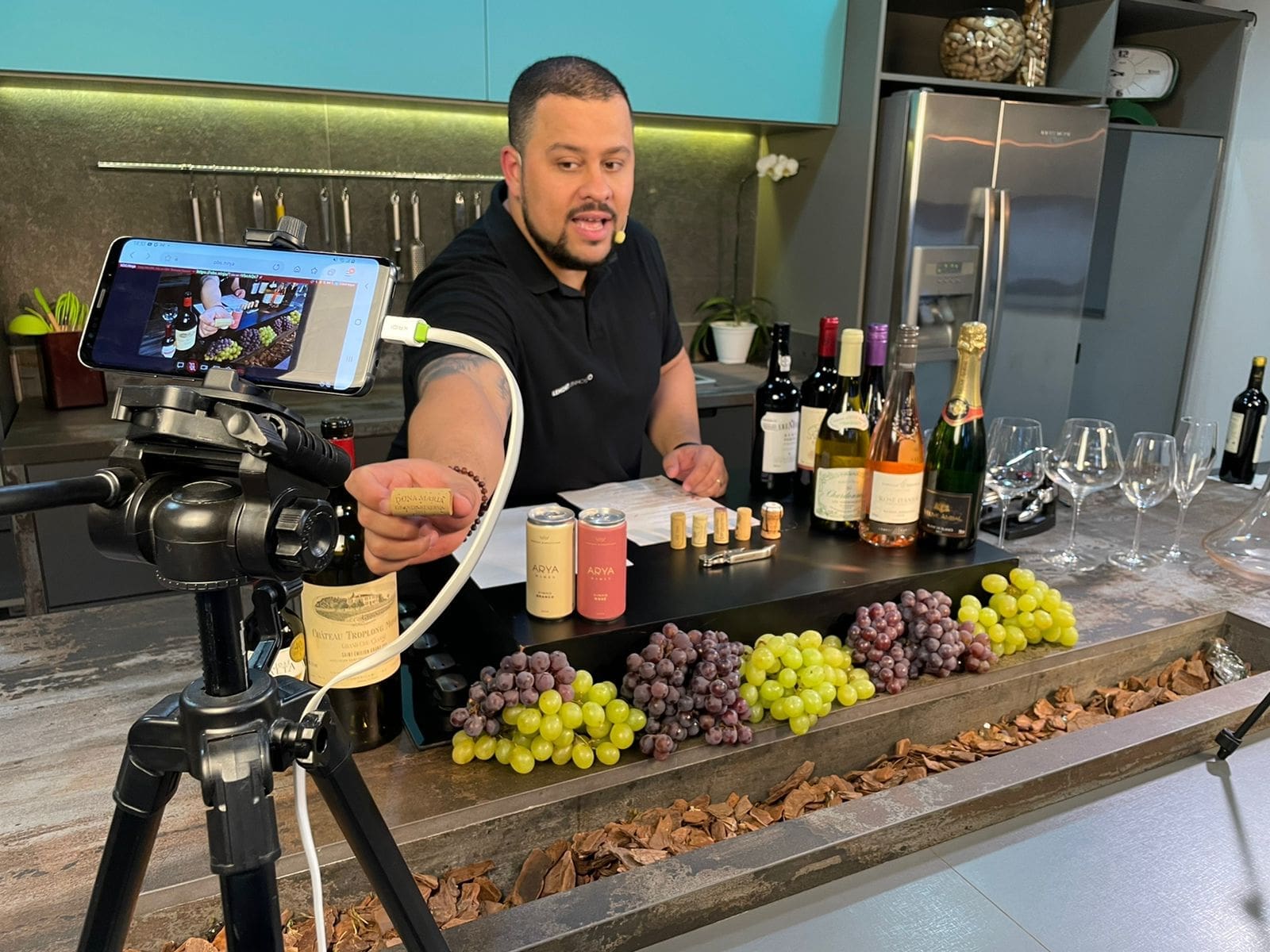 Os participantes que já haviam recebido seus kits em casa, contendo os vinhos que seriam degustados.