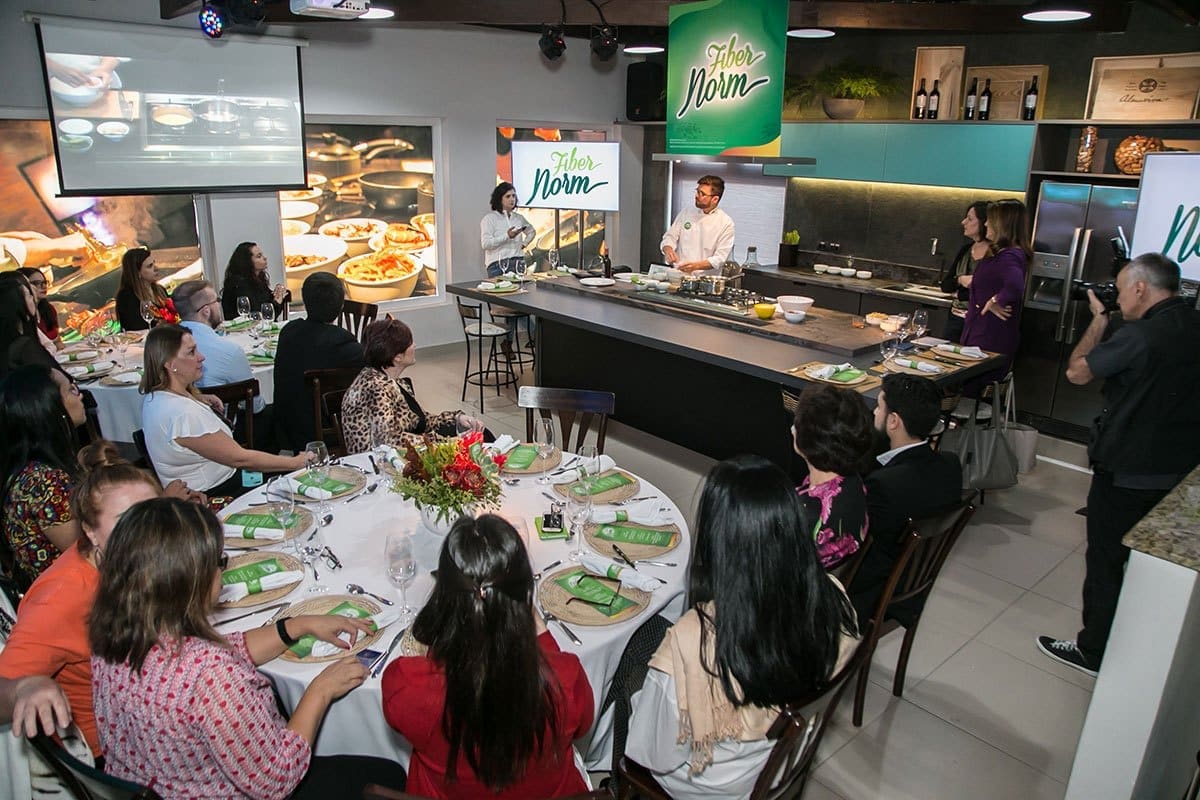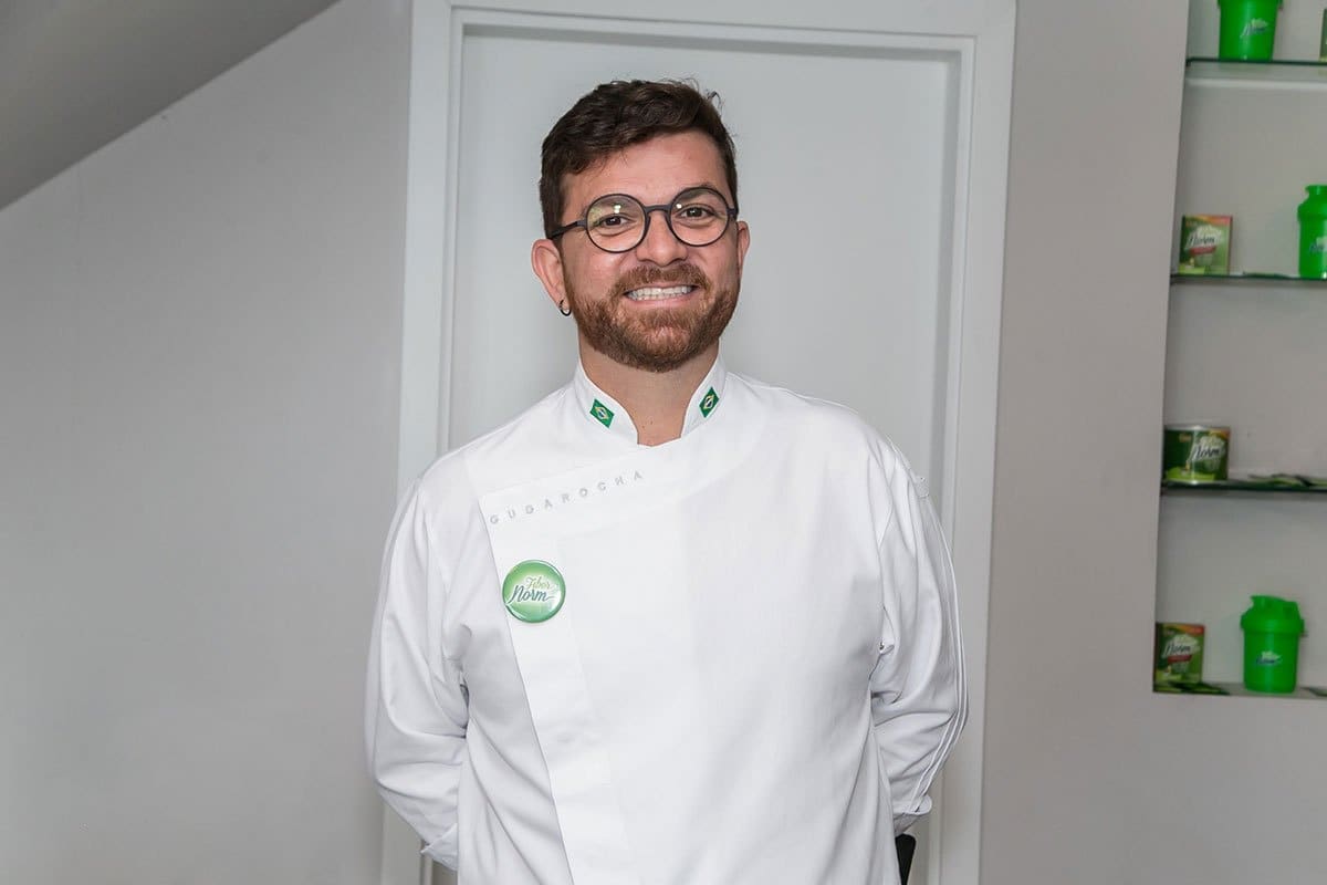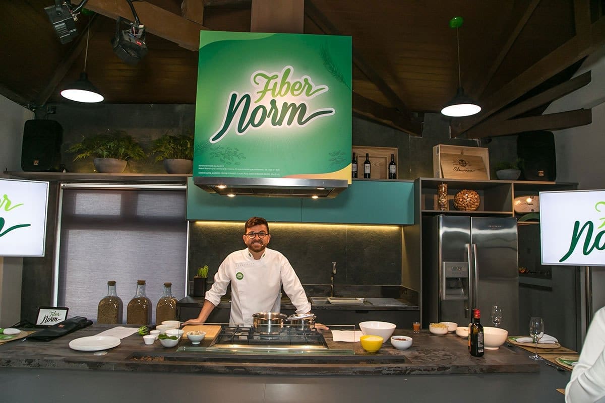 Após o bate-papo, os convidados desceram novamente para o hall inferior onde se depararam com uma incrível surpresa: lá estava o renomado Chef Guga Rocha, que após uma agradável conversa, revelou que todos participariam de uma fantástica experiência gastronômica, onde iriam aprender algumas receitas deliciosas com a utilização do mix de fibras FiberNorm.