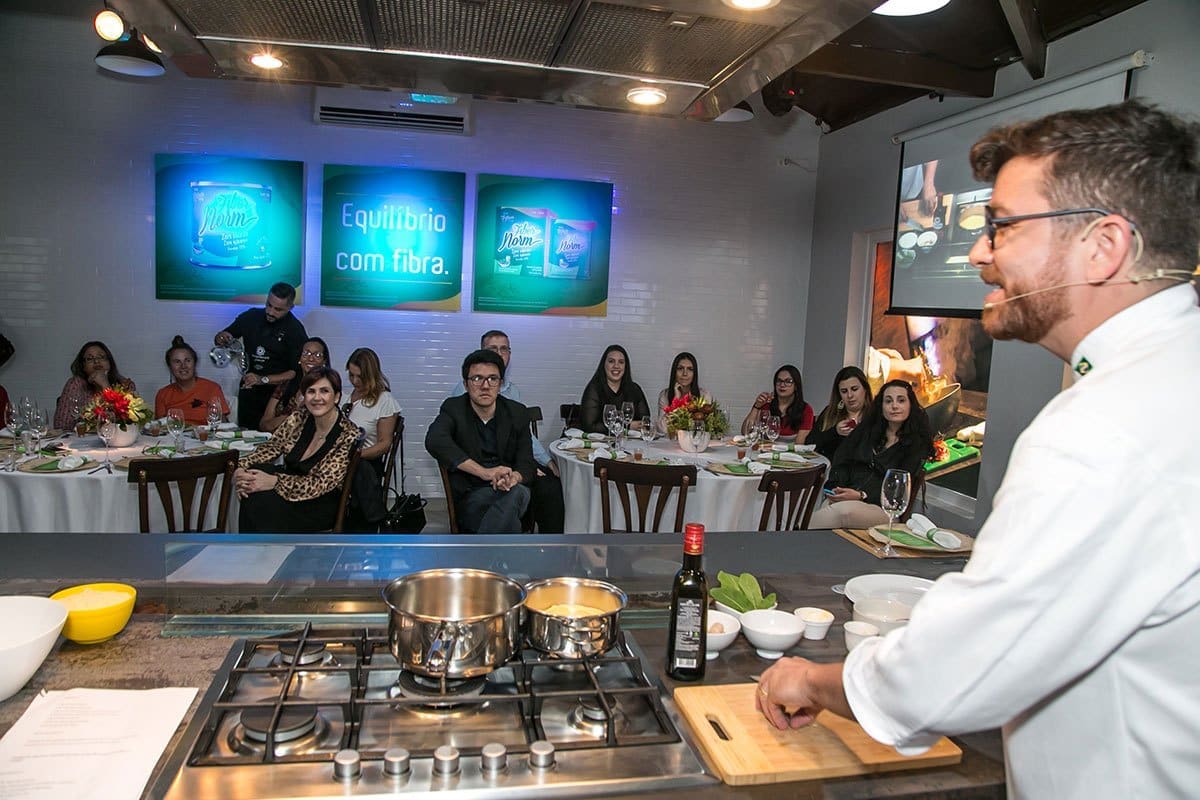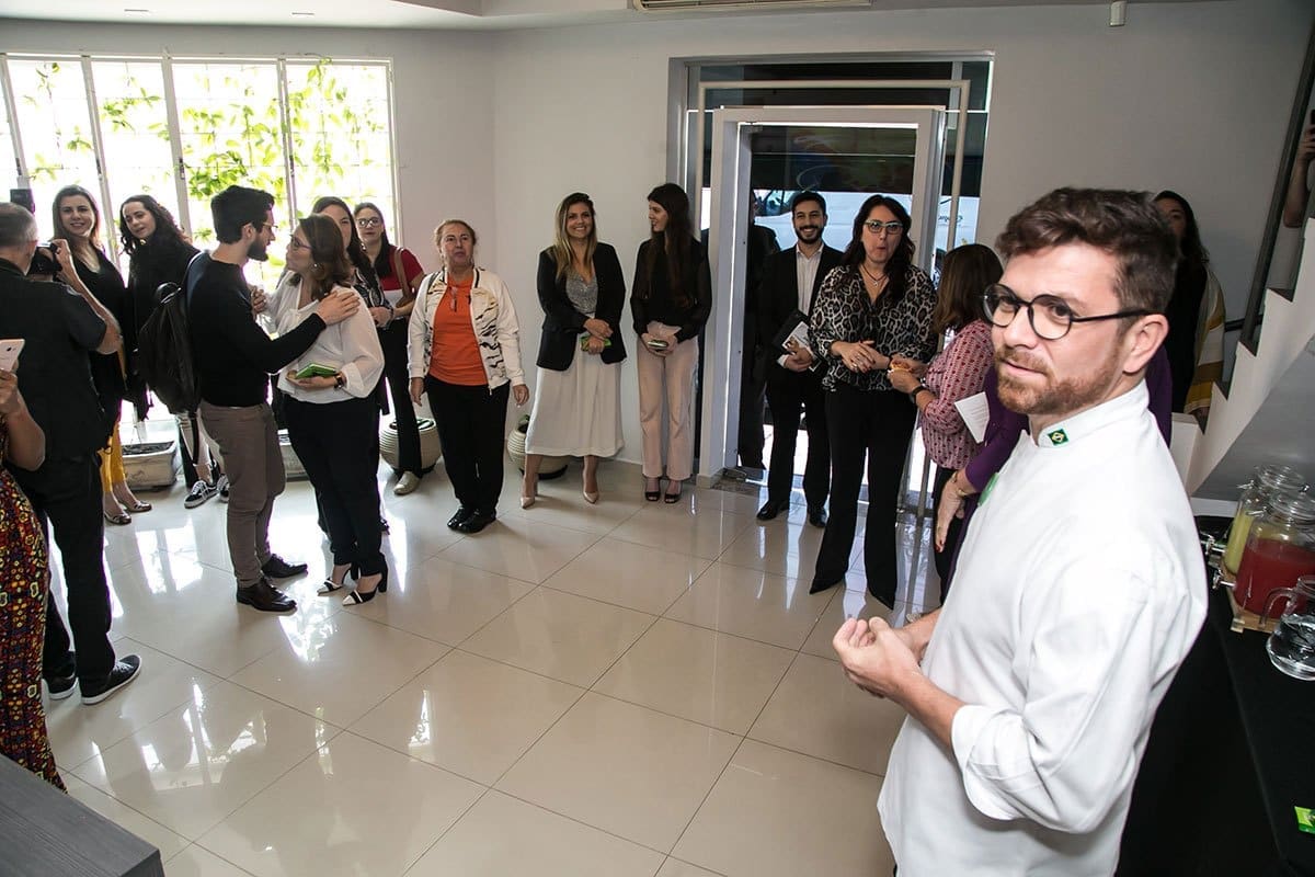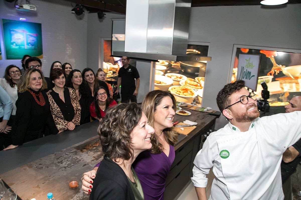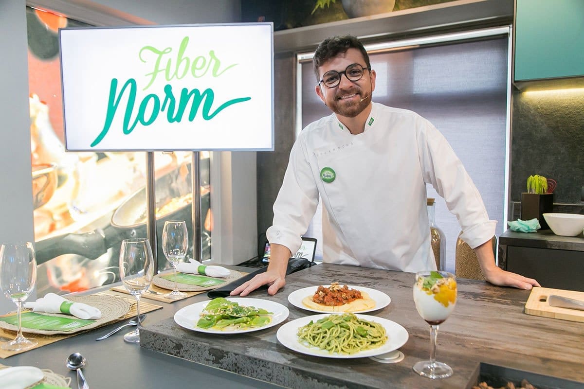 Após o bate-papo, os convidados desceram novamente para o hall inferior onde se depararam com uma incrível surpresa: lá estava o renomado Chef Guga Rocha, que após uma agradável conversa, revelou que todos participariam de uma fantástica experiência gastronômica, onde iriam aprender algumas receitas deliciosas com a utilização do mix de fibras FiberNorm.