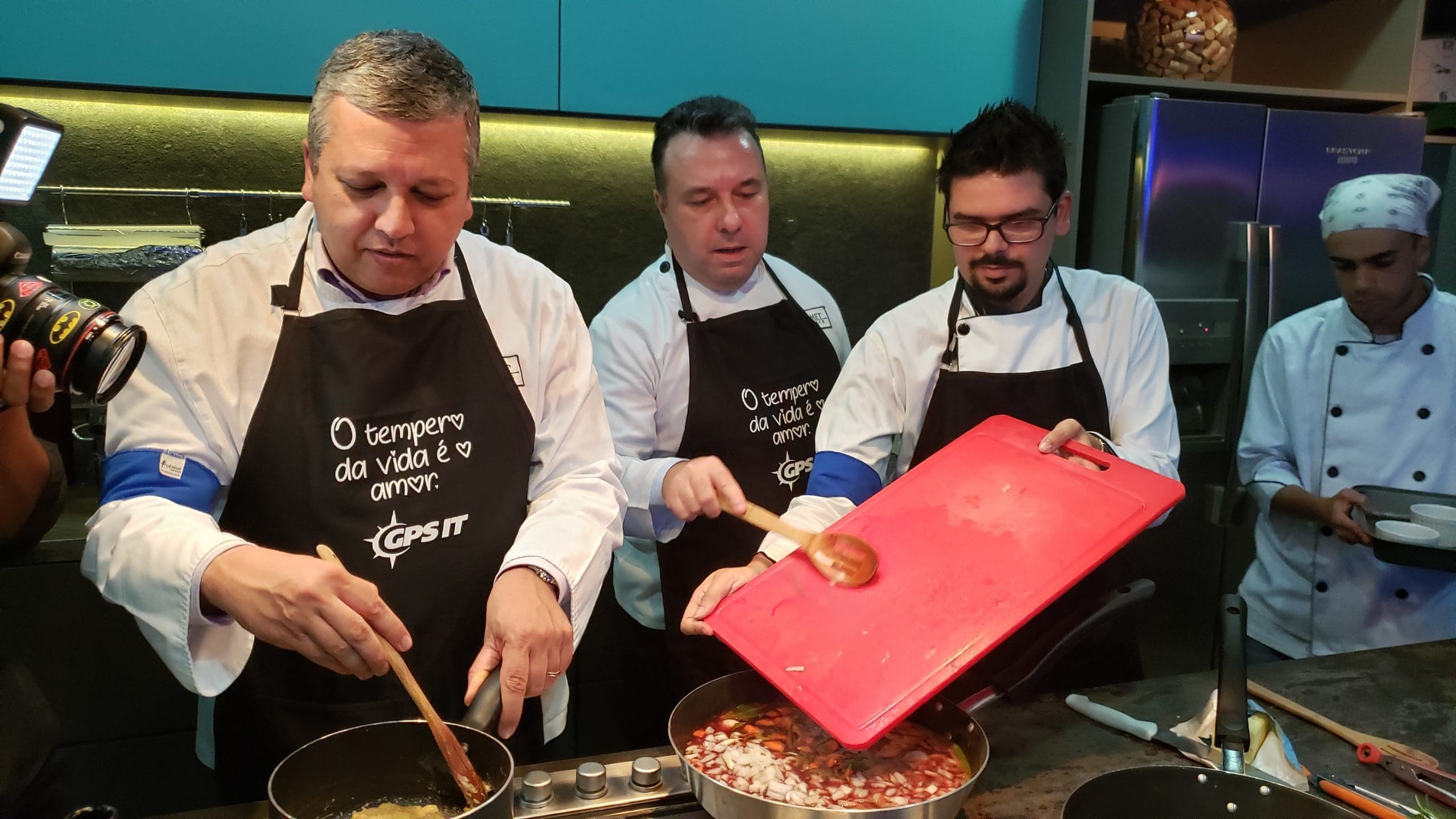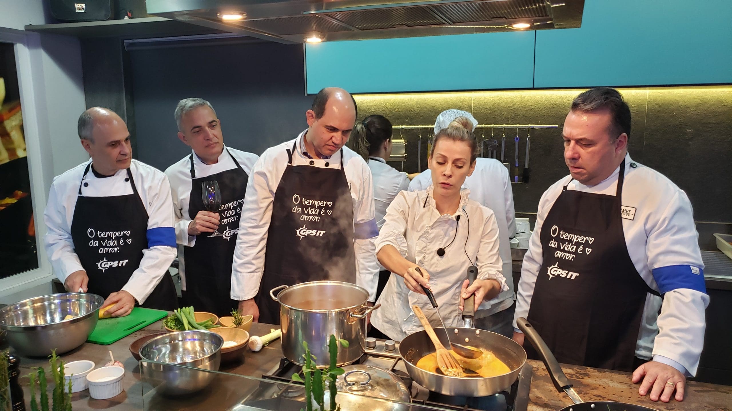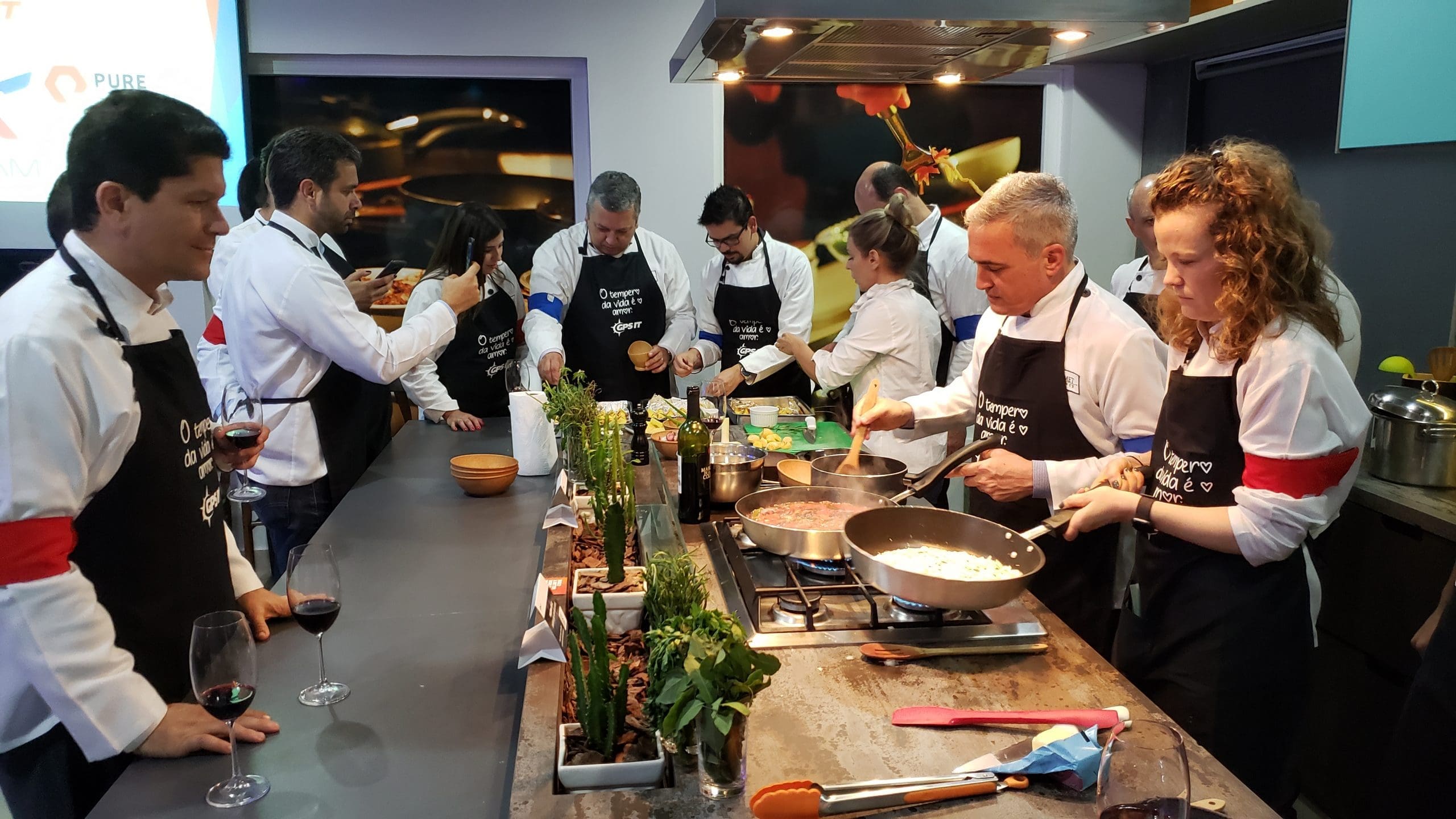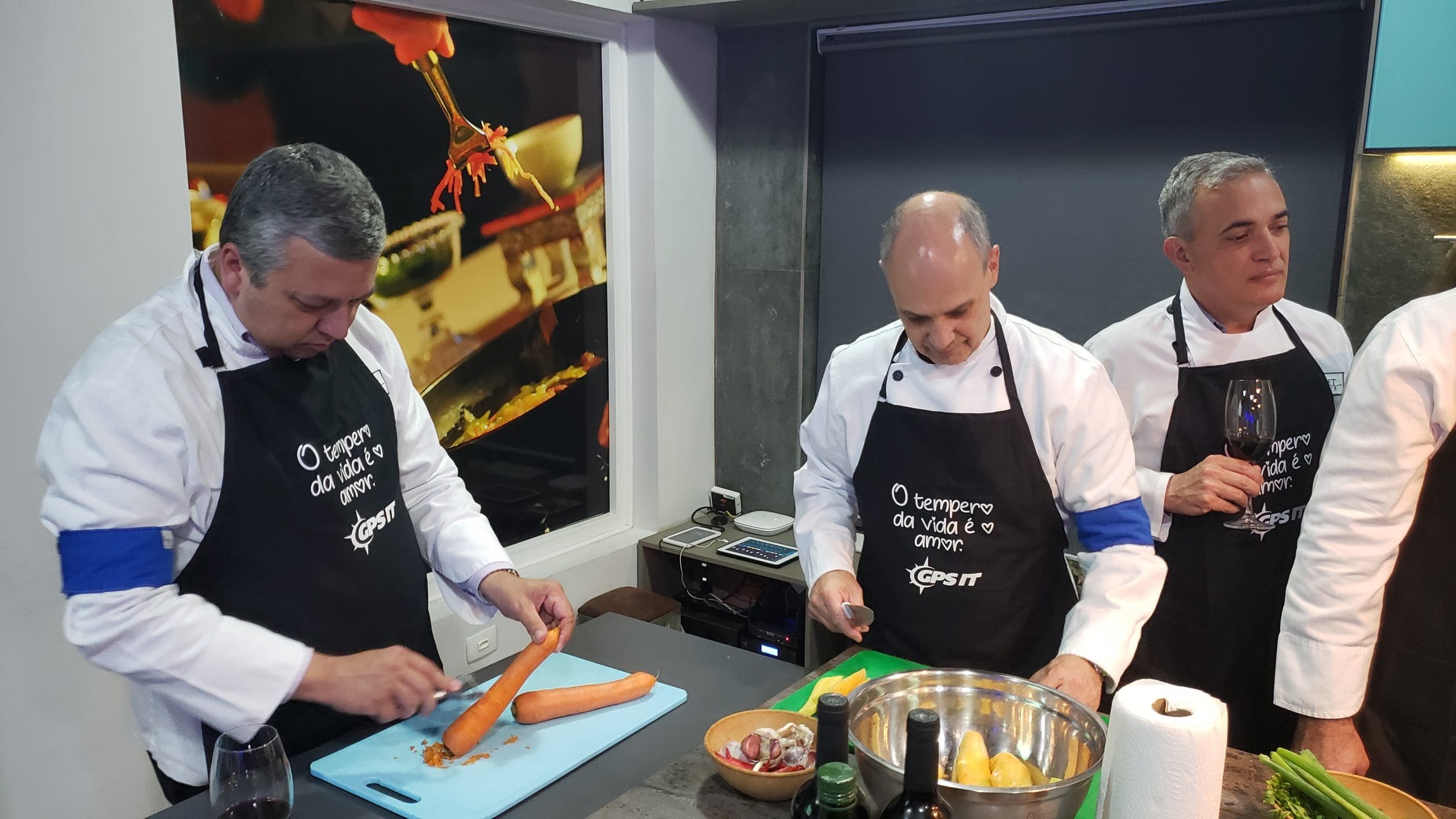 Como nesta divertida dinâmica de team building realizada para os clientes e parceiros da GPS IT, onde os convidados foram recepcionados com um delicioso coquetel produzido especialmente por nossa equipe e em seguida foram convidados a vestir os dólmãns se transformando em chefs de cozinha por um dia, para colocarem a mão na massa e assim elaborarem o próprio jantar composto de entrada, prato principal e sobremesa.