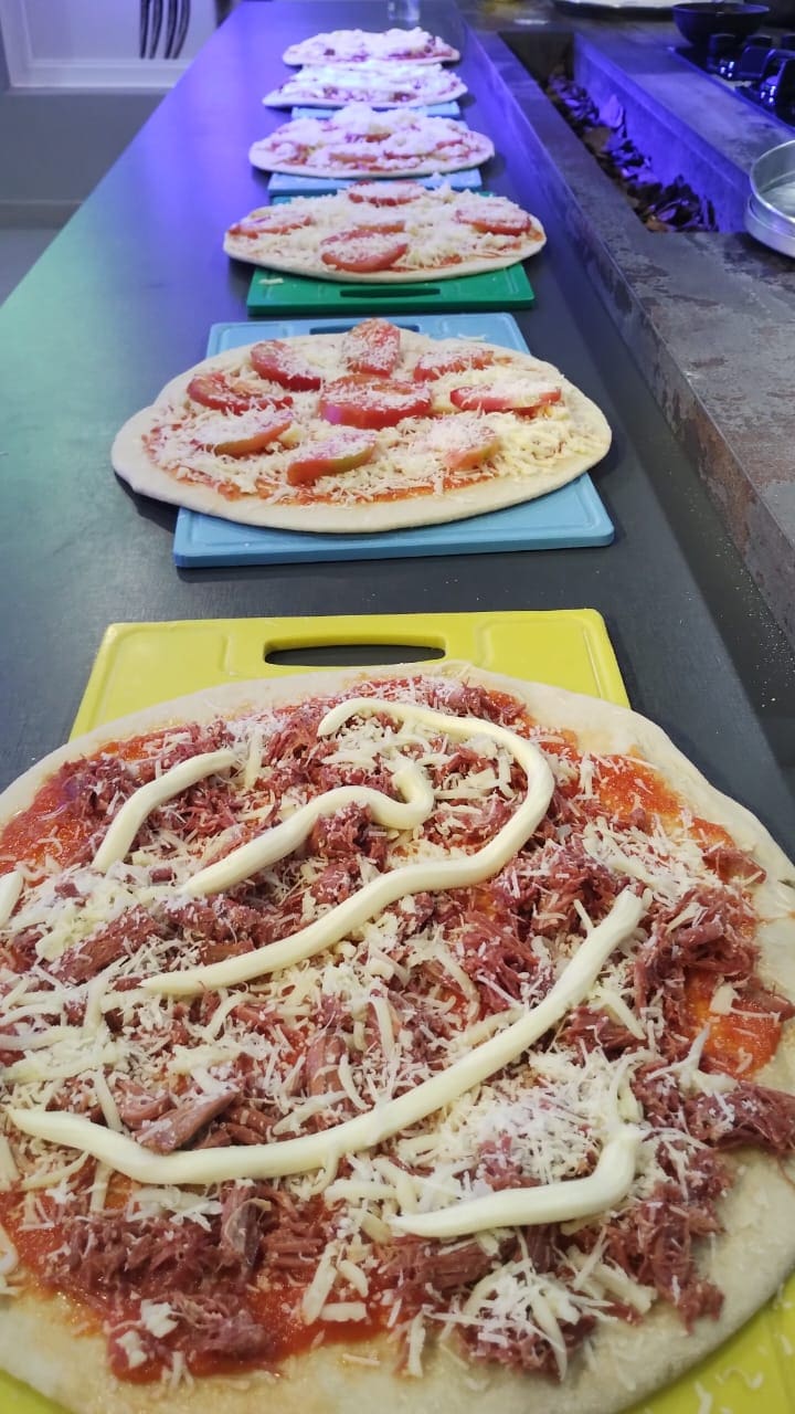 Desde o início, a equipe foi muito participativa, preparando a massa das pizzas, abrindo os discos e escolhendo os recheios para as pizzas salgadas e doces.