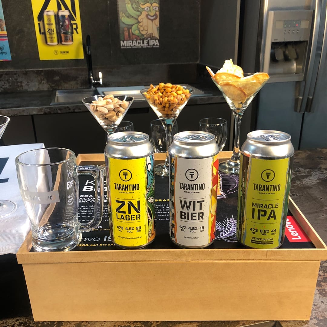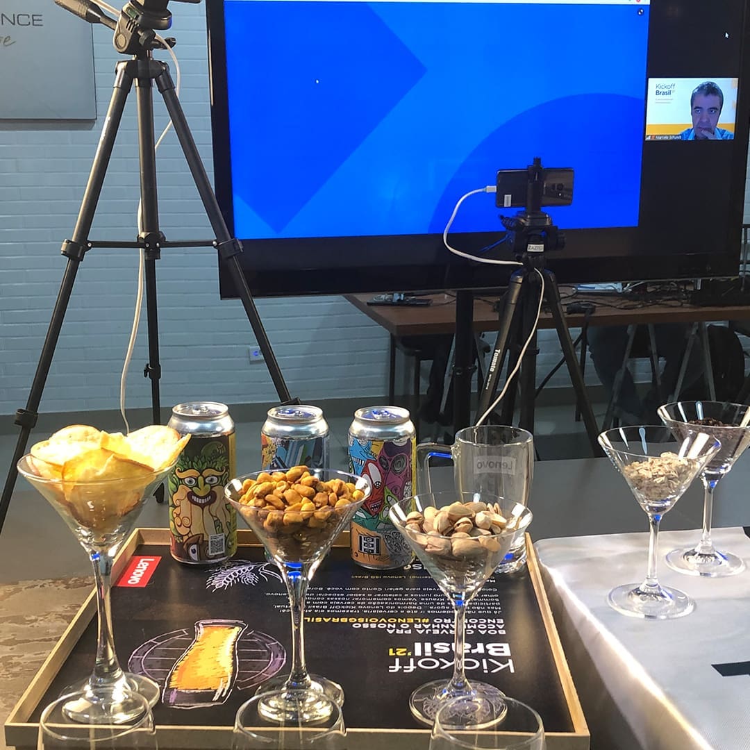 Imagina só a expectativa dos 76 participantes quando receberam nas suas casas uma caixa personalizada contendo 03 cervejas e um kit de petiscos especiais: provolone desidratado, milho-torrado e pistache.