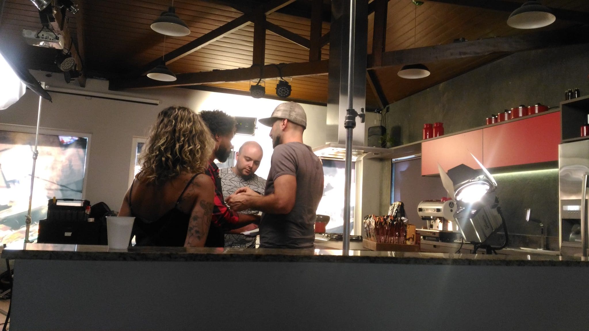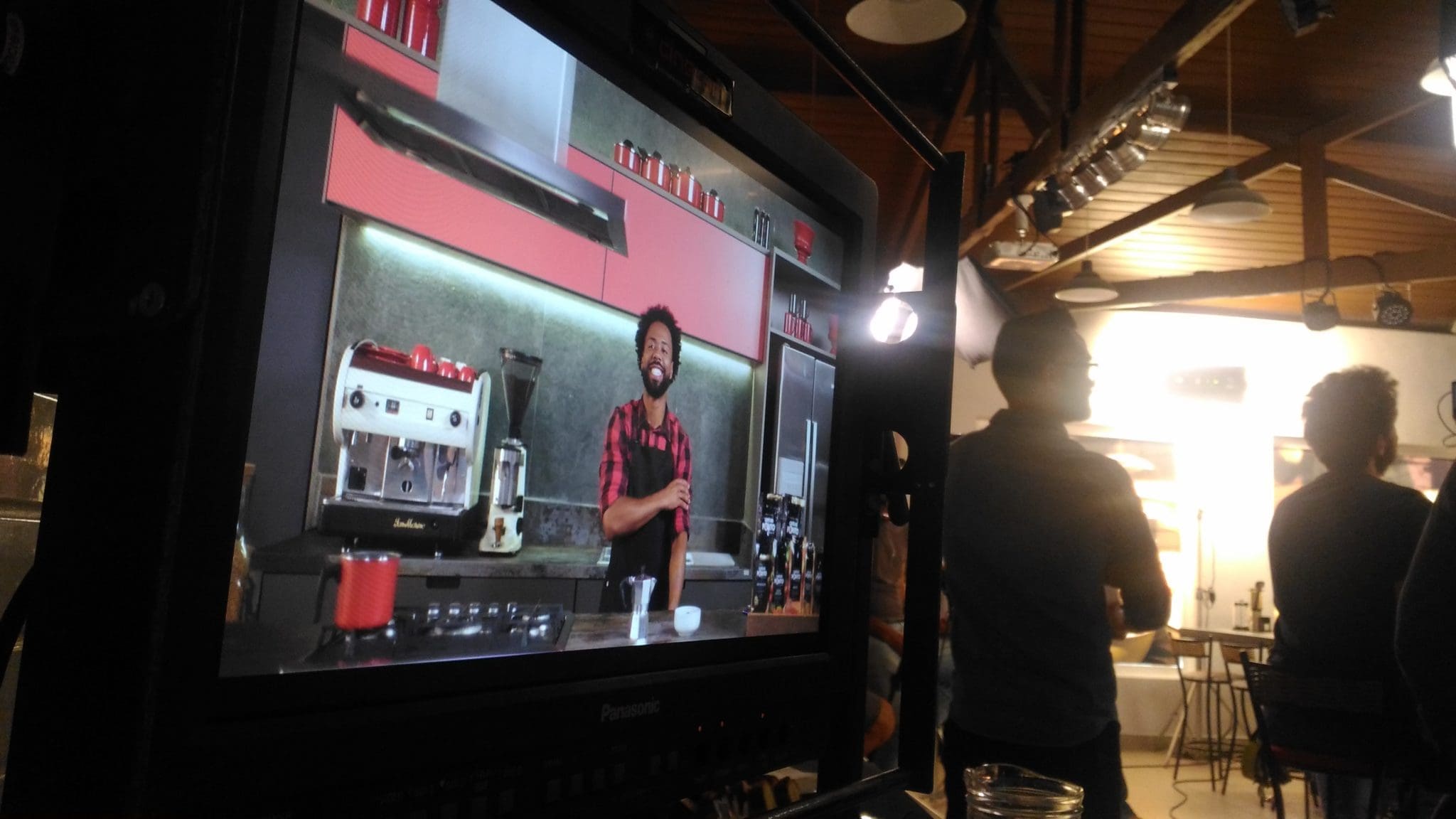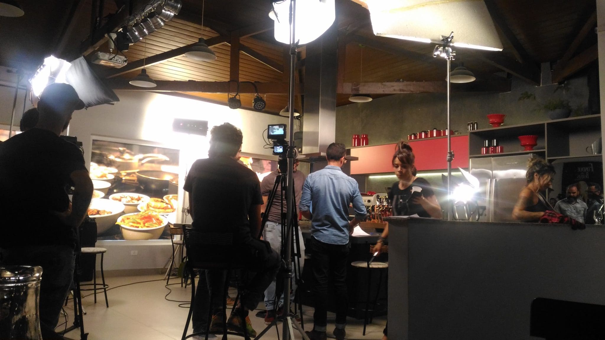 No caso da 360 Media House, foi desenvolvido um clima bem típico de cafeteria. Foi utilizando nos armários tons em vermelho e utensílios preto que harmonizou muito bem com o design moderno da nossa cozinha gourmet e o restante da decoração. Todo um ambiente para demonstrar o aconchego que um café bem quentinho pode nos proporcionar.  Após cenário pronto, foi hora de muita luz, câmera e ação!