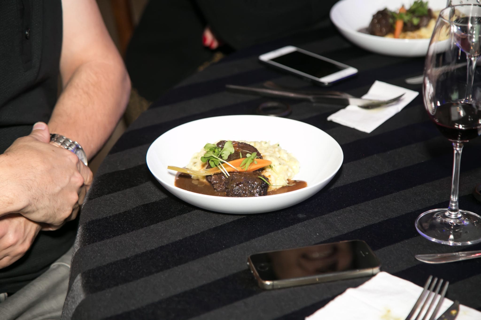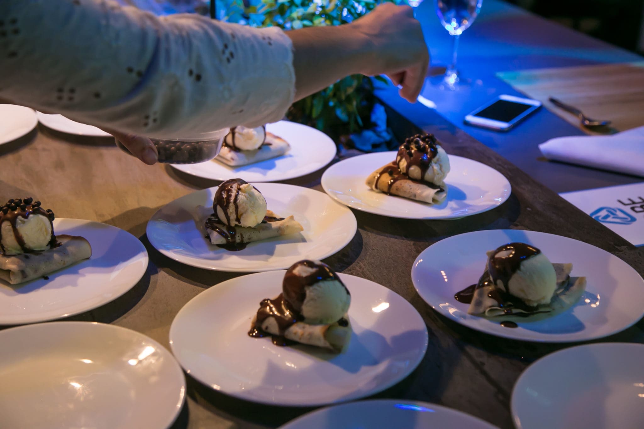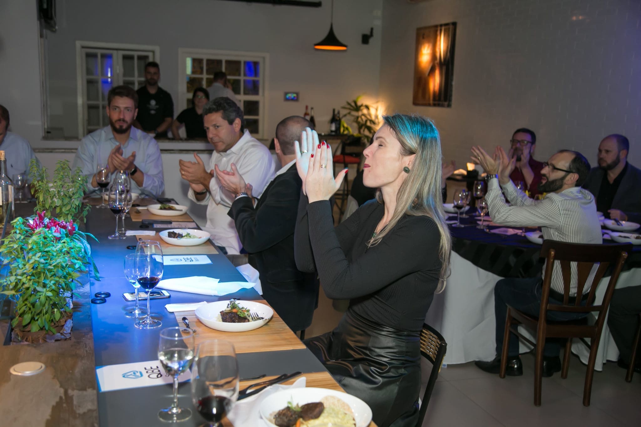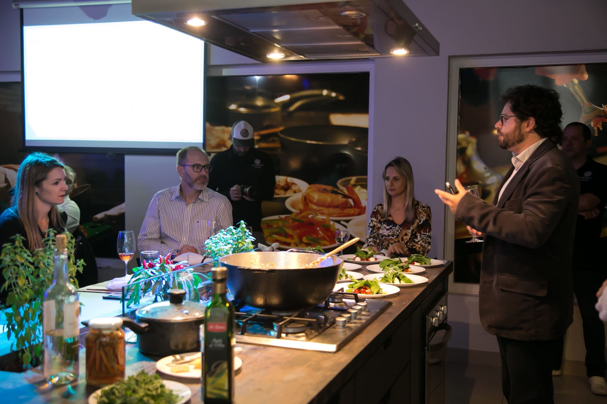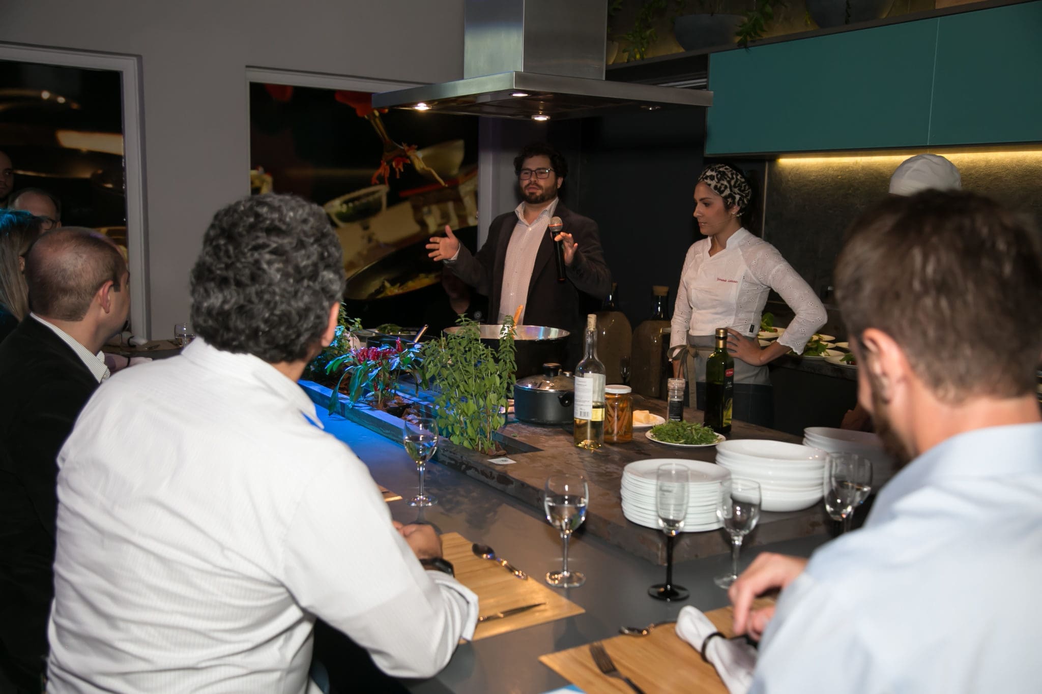 Chegou o esperado momento, o qual os convidados foram envolvidos com a explicação do enólogo João Felipe Pedroso da vinícola Guaspari, harmonizando a deliciosa salada caprese com o vinho Cisplatino Cabernet Franc Rosado, o mesmo descreveu detalhadamente como apreciar um verdadeiro clássico. Logo após a entrada, o prato principal servido foi um saboroso Risoto de parmesão com Brasato ao vinho tinto harmonizado com o vinho Guaspari Vale da Pedra Tinto – mais um momento para o enólogo João Felipe Pedroso dar mais dicas de como saborear um bom vinho. E para finalizar a noite docemente, uma deleitosa sobremesa de Crepe de Nutella com sorvete em companhia do licoroso vinho Madeira Justino’s foi servida. Realmente a noite foi sensacional e uma experiência incrível.